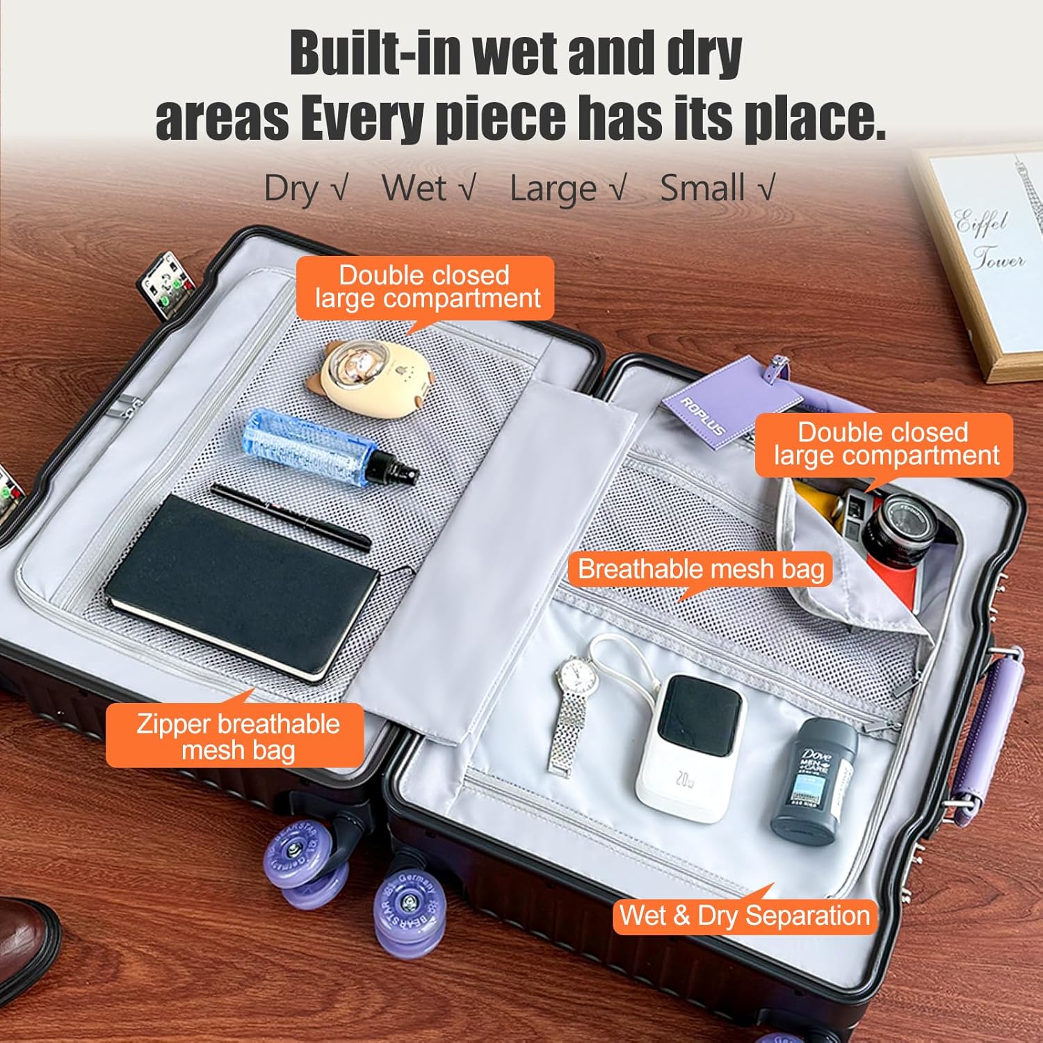 - LARGE STORAGE SPACE: Storage is the strength of this luggage. This aluminum framed suitcase has a large interior storage space with wet and dry compartments and two oversized zippered compartments for your laptop and more