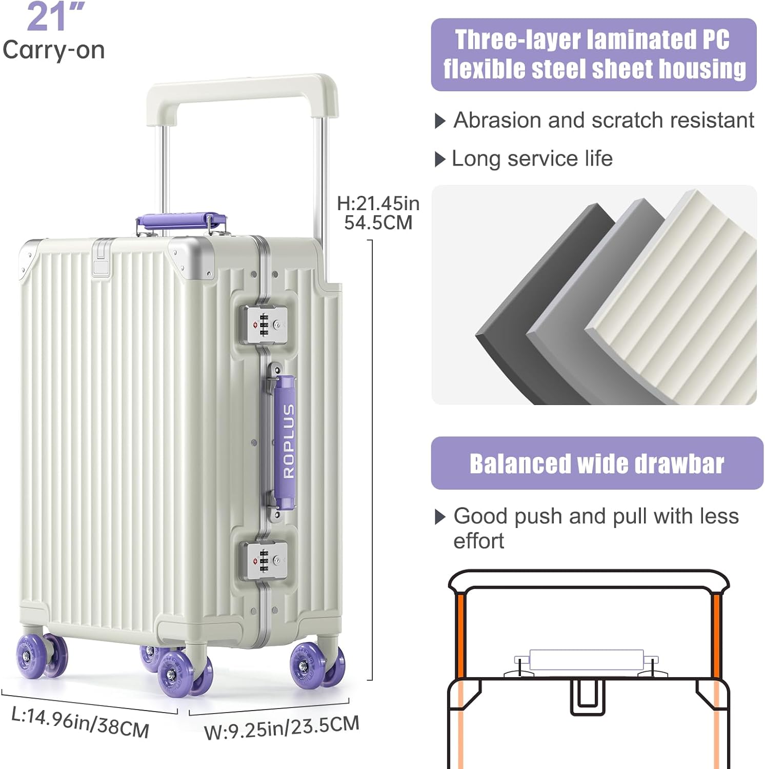 Aluminium Frame Carry on Luggage with Smooth Jelly Wheels, Hardside Zipperless Rolling Suitcase with TSA Lock (WhitePurple, 21-Inch)