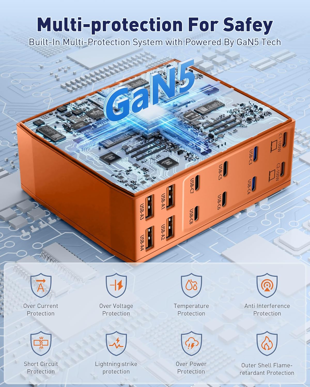 - ă12-in-1 USB C Charging StationăThis 600W USB C Charger Block comes with 8 USB C ports and 4 USB A ports to charge multiple devices, simplify your charging setup, and let you experience the convenience of ultra-fast and ultra-high output charging. With its smart charging technology, it can automatically detect and provide the best power output for each connected device, ensuring fast and efficient charging.