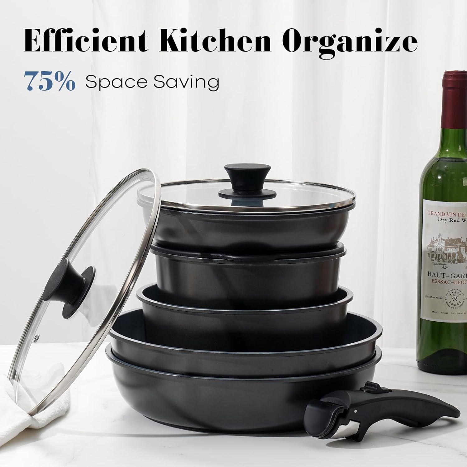 - Space-saving Design - Removable handles of pots and pans set allow for compact stacking, maximizing space savings of up to 75% for cabinets, apartments, RVs, and campers.