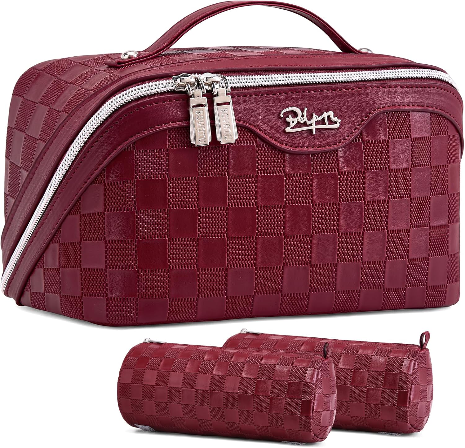 Travel Makeup Bag Organizer Cosmetic Bag: 3 Pcs Set Make up Bags for Women with Handle - Waterproof Vegan Leather Toiletry Bags with Comparments (C-11-Red)