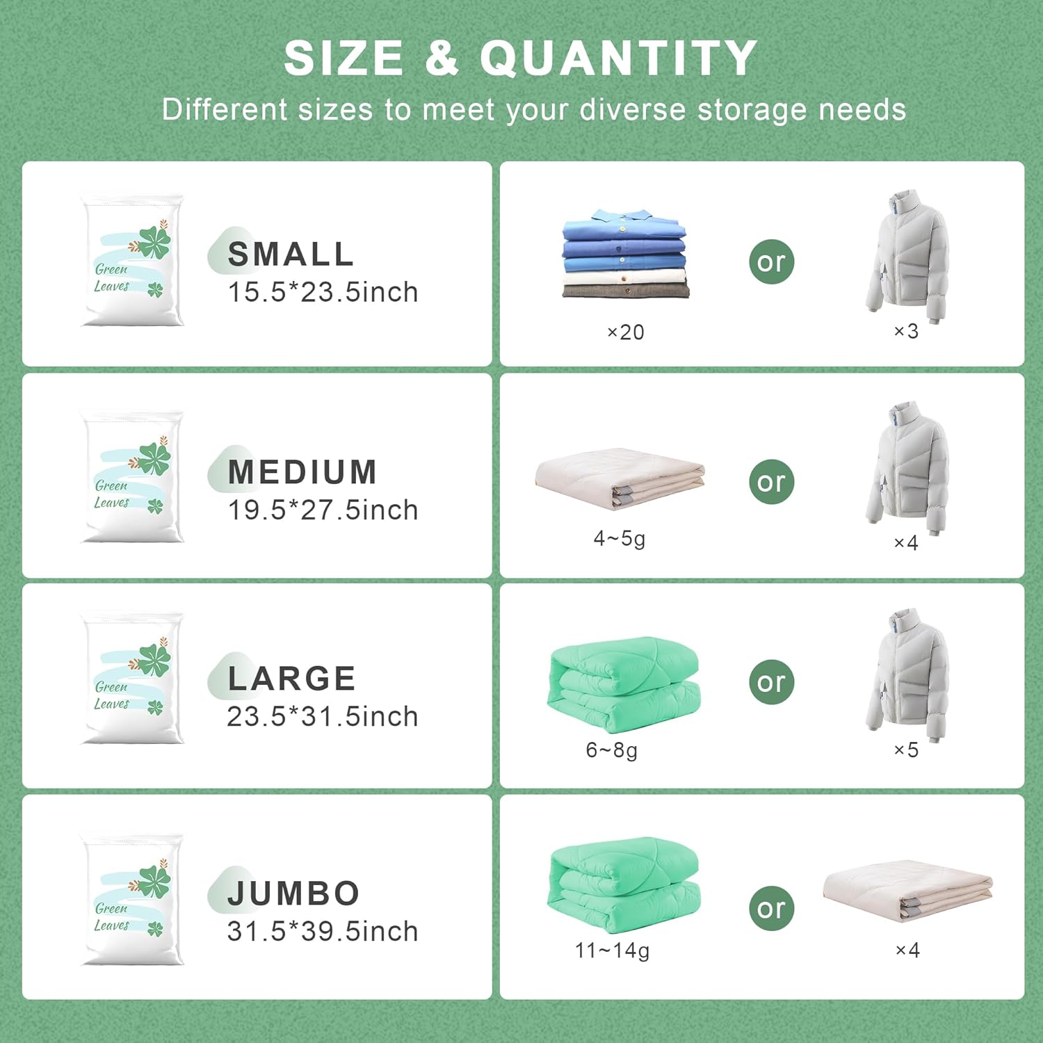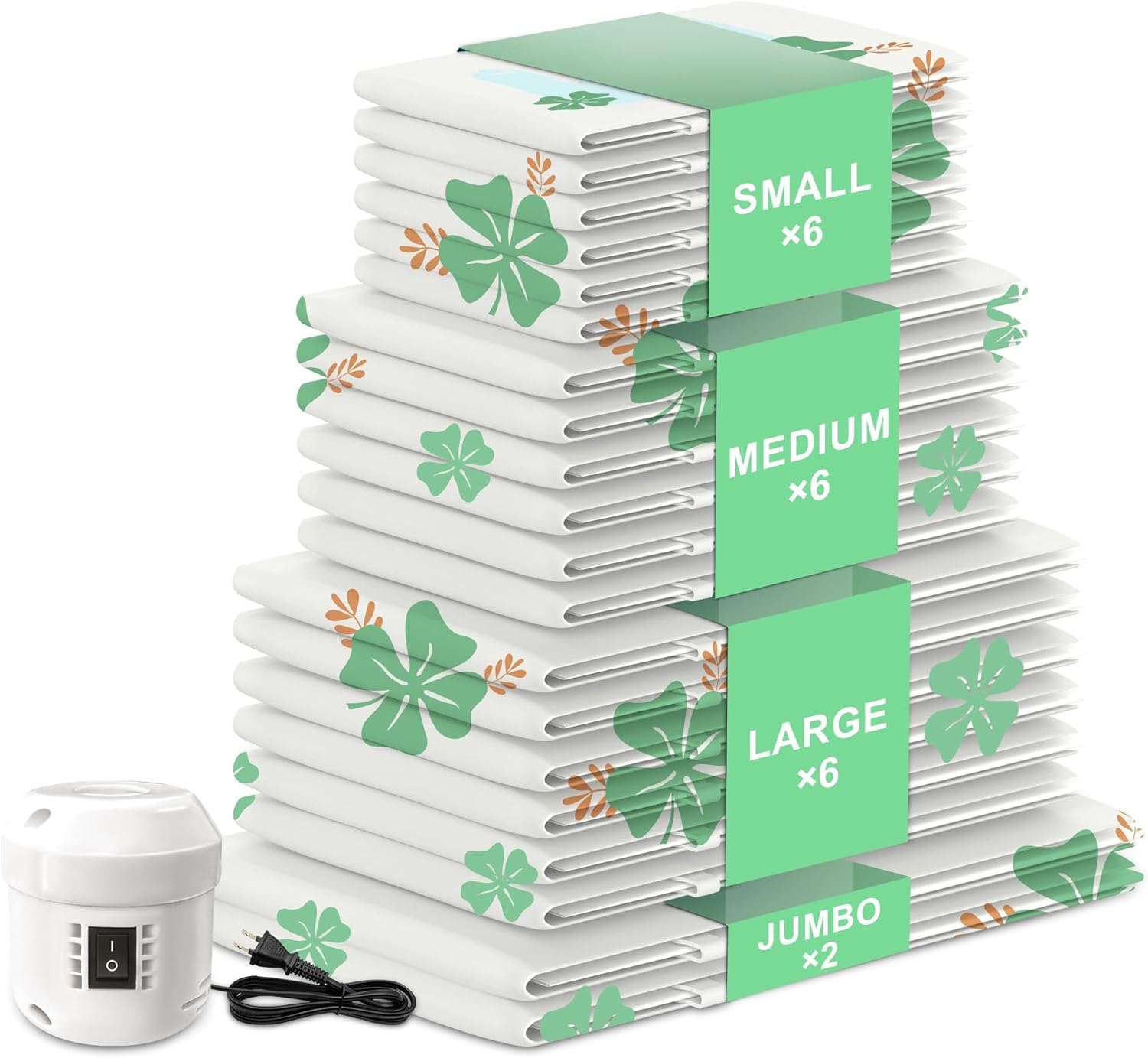 - 【Complete Value Bundle】---4 Sizes + Electric Pump = Ultimate Storage Solution. Get the perfect size for every need: Small (for shirts, kids' clothes), Medium (for sweaters, pillows), Large & Jumbo (for comforters, blankets) PLUS the essential electric pump. This whole set can meet your daily life and travel needs