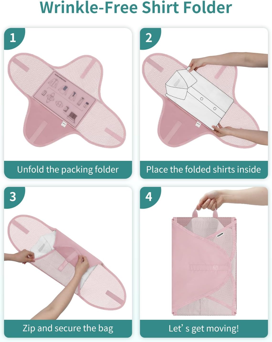 WANDF 7 Set Compression Packing Cubes for Travel, Shirt Folder for Wrinkle-Free, Suitcase Organizer Bags Set for Carry-On Checked Luggage Duffle Bag Women Men(Pink)