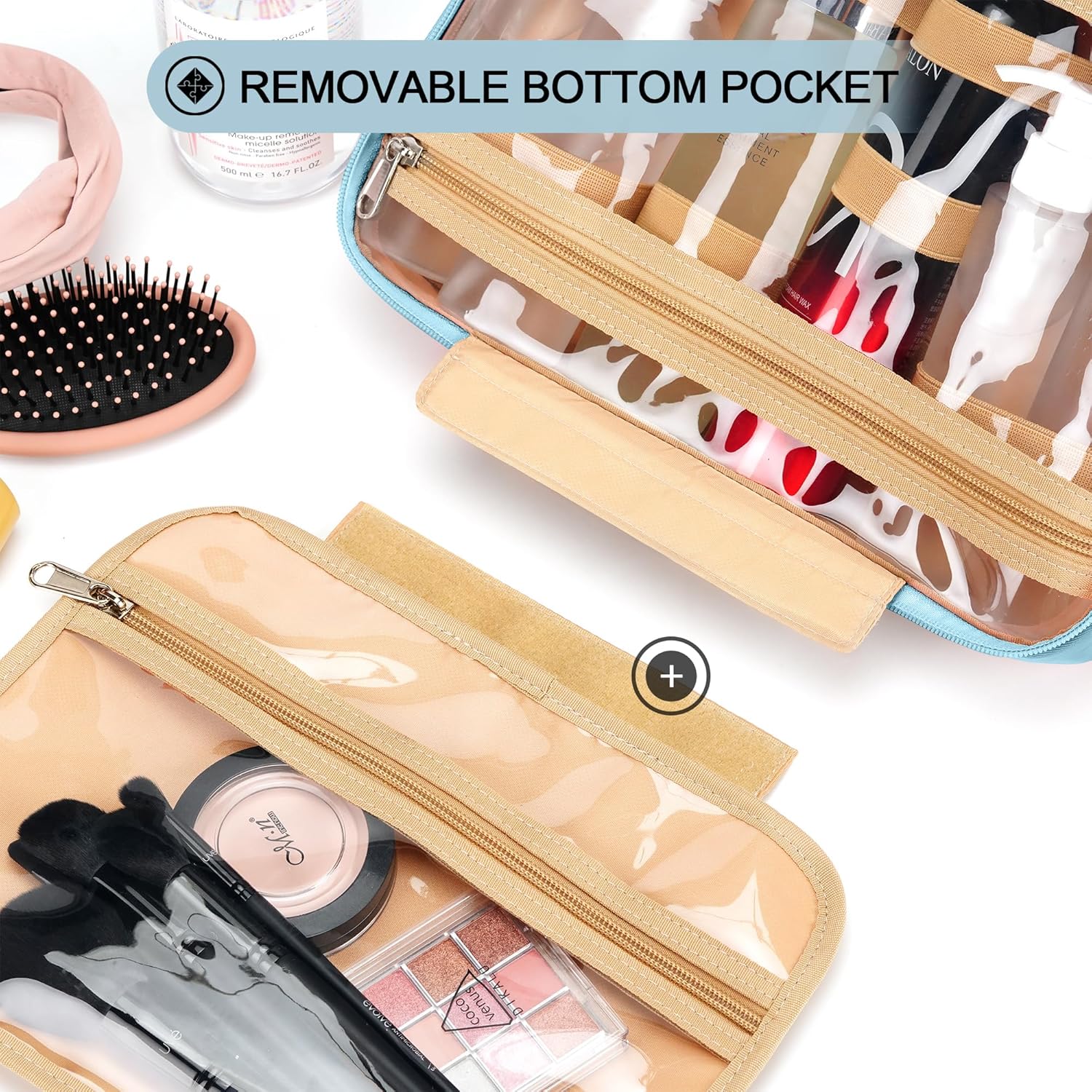 - CONSIDERABLE DESIGN - The elastic bands inside the two main compartments can keep the different height bottles fixed and upright. Your comb, toothbrush, razor, and leak-prone makeup can all go in there, even a hair dryer. 360° metal hook gives you a variety of hanging options.