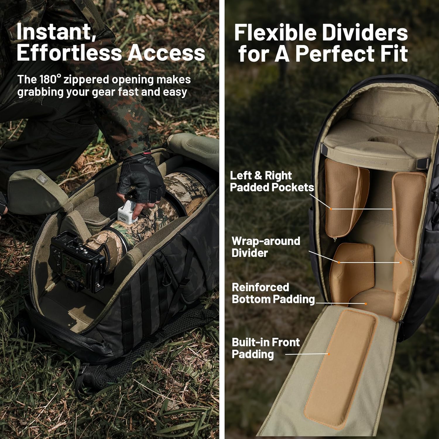 - Large-Opening Access & Flexible Storage: Featuring a large front opening, Quick and easy retrieval of equipment. Customizable DIY dividers securely hold a 600mm prime lens with a camera body or adjust to fit smaller lenses like a 400mm prime alongside additional gear.(Supports a fixed focal length lens up to 1200mm plus camera body)
