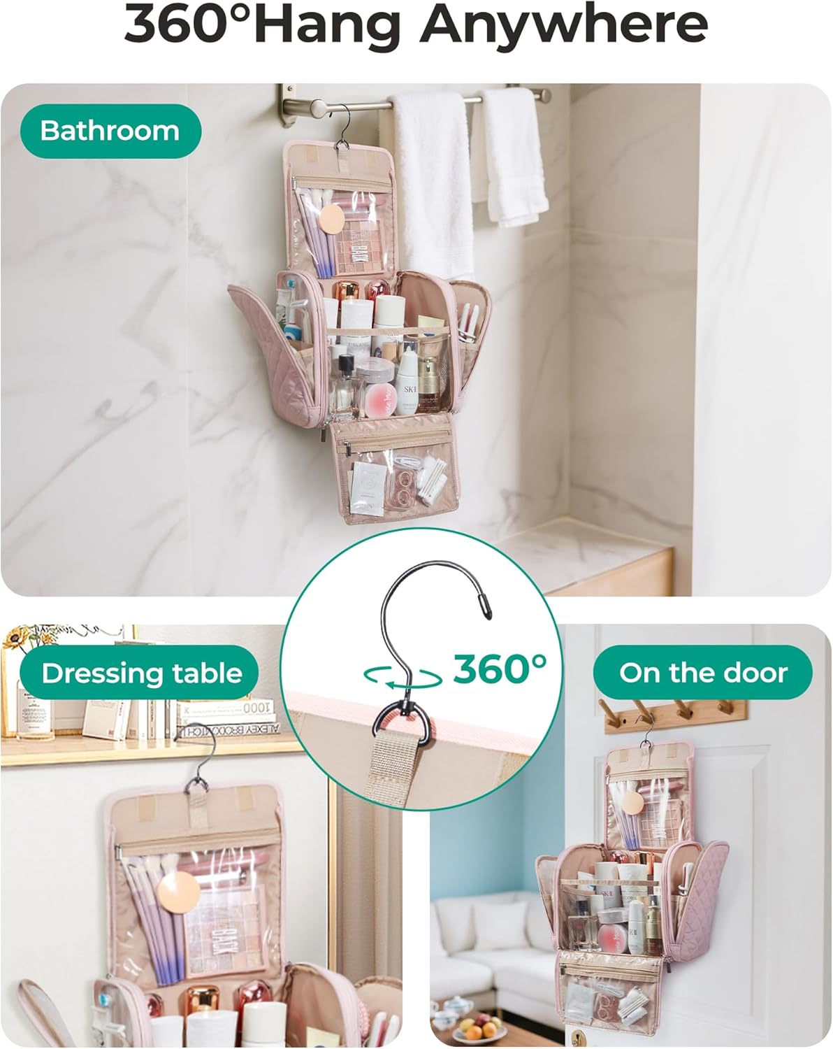 - 【Easy to Use】: With 3 transparent pockets, this hanging makeup bag organizer makes it effortless to keep your essentials organized. The left side pocket features a stain-resistant PVC lining, which is tailored to store makeup brushes, powder puffs, sponges, and other items that require special consideration. The top and bottom transparent pockets provide additional storage space while ensuring easy accessibility to small items.
