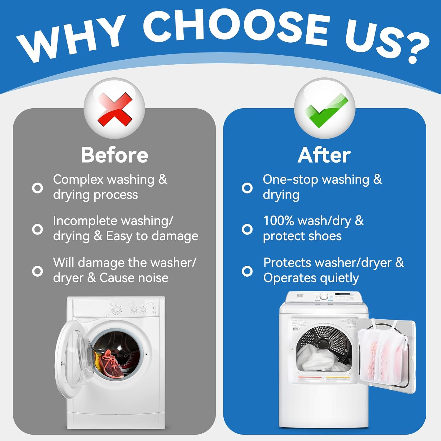 - 2-in-1 Secret Weapon: Easily adapts to any freestanding washer or dryer, even a washer-dryer combo can be used without unloading. Shoe washing machine bags are a must-have for keeping shoes and clothes clean and fresh in dorms, apartments, laundromats, hotels, travel and more