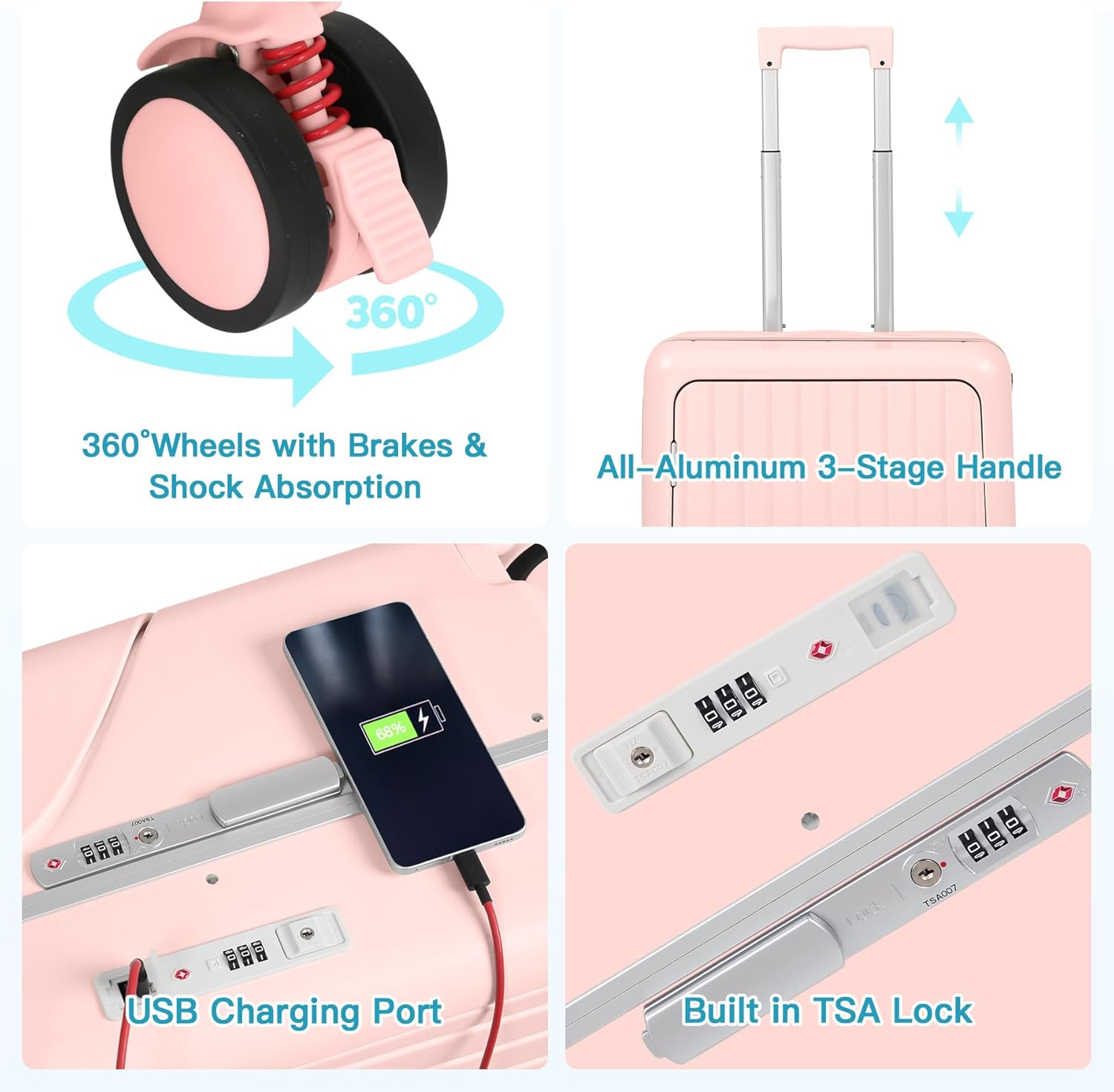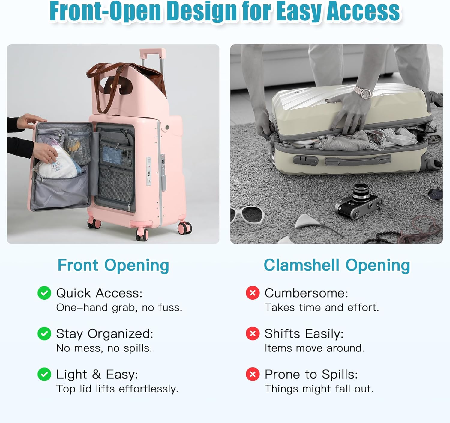 - 【Front-Open Design】 Access your belongings easily with the front-opening design that allows you to grab items with one hand. The top lid opens smoothly for quick access. The durable all-aluminum 3-stage telescoping handle offers easy maneuverability, and the built-in TSA lock adds extra security for peace of mind. Ideal for both kids and adults, this ride-on suitcase ensures a smoother, more efficient travel experience.