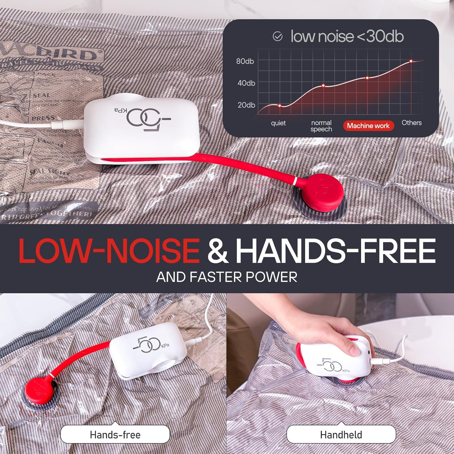 - Whisper-Quiet Operation: Motor-driven pump operates quietly, ideal for late-night packing or shared spaces