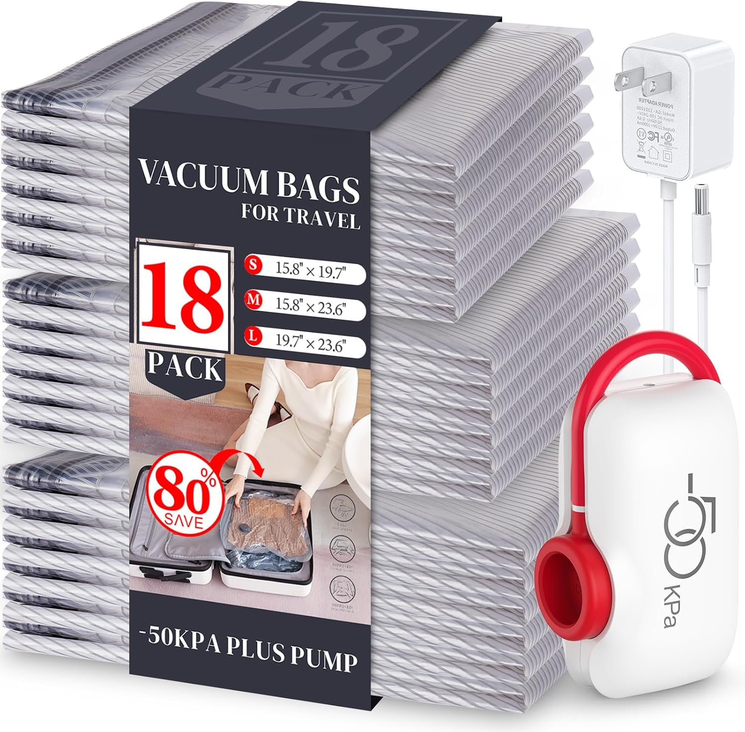 VMstr 18 Pack Travel Vacuum Storage Bags with High Pressure Electric Pump(D/C Power), Carry-on Size Space Saver Compression Bags for Clothes, Luggage & Packing