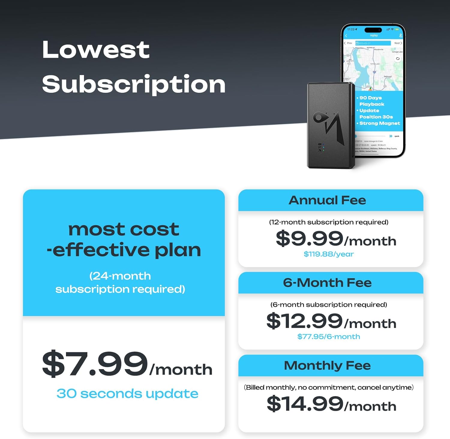 - Affordable Subscription: Our GPS tracker subscription fee is the lowest, the monthly fee is $14.99, and the long-term prepayment is as low as $9.99/month. And GPS tracker comes with app, compatible with Android, iOS. It is small and light, easy to carry, and can be easily installed on any metal surface. Size: 1.57 in x 3.07 in x 0.79 in (LxWxH)