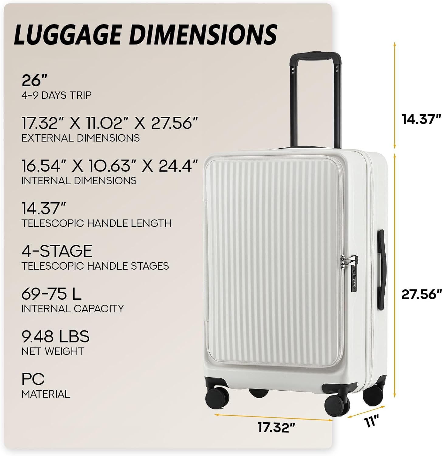 - Lightweight 26 Inch Medium Suitcase:This 26 inch luggage (27.56" x 17.32" x 11.02") weighs only 9.48 lbs, making it a light weight luggage option with generous capacity. A medium suitcase with wheels designed for business trips, vacations, or as reliable check luggage for longer journeys