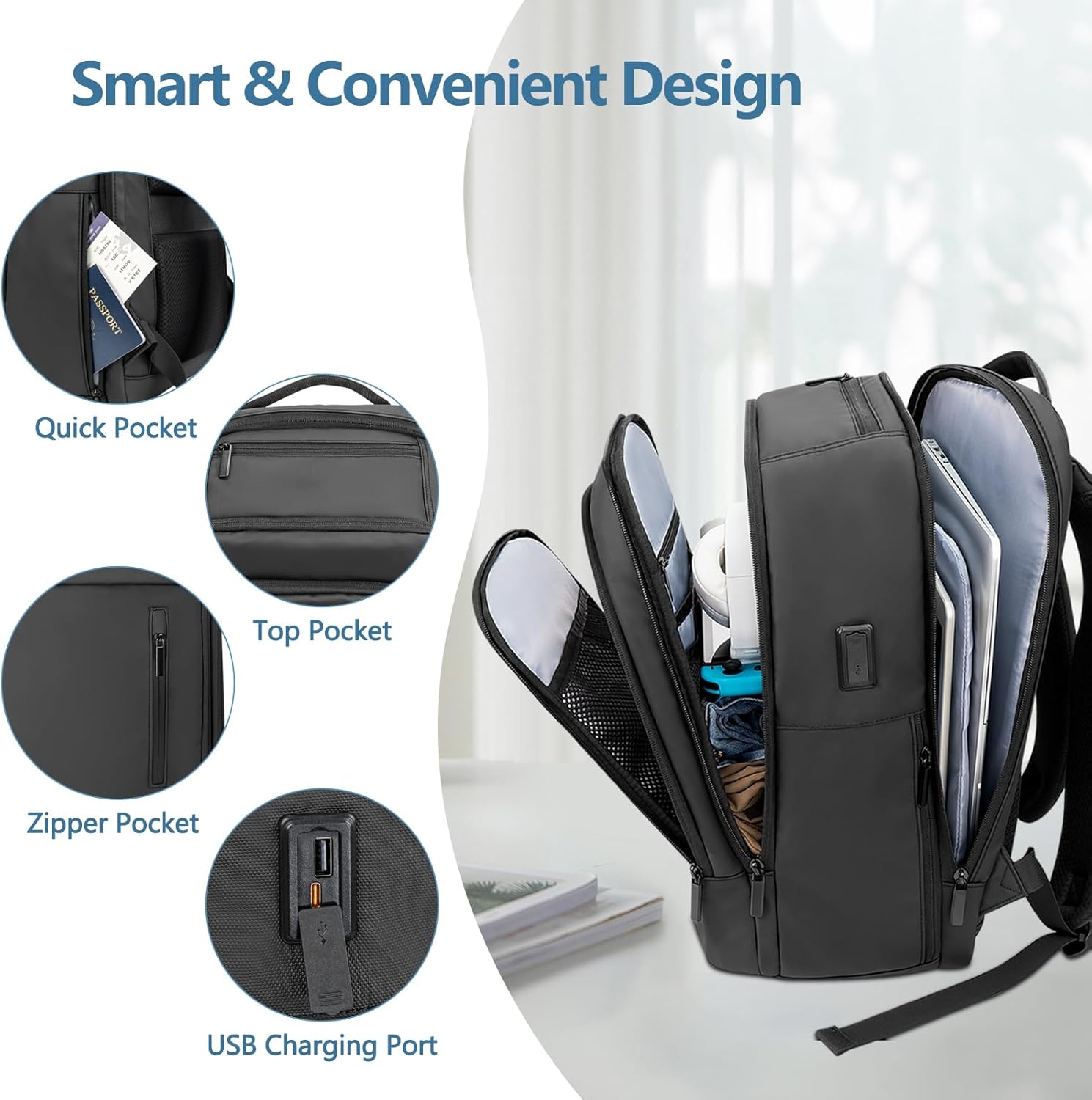 - 【Large Design】This work backpack is up to 8inch thick and can hold enough for a 2-3 day trip.①. In the front and top of the waterproof backpack there is a unique pouch designed for storing your data cable car keys headphones etc.②. This anti-theft backpack features a unique hidden zipper design on the surface to protect your valuables.③. The main compartment have multiple multi-functional pockets.④.The backpack includes a dedicated laptop compartment for convenient airport security checks.