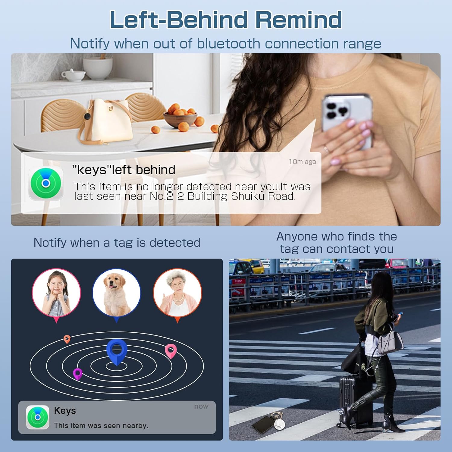 - 【Smart Left-Behind Remind】Get instant phone notifications if your item goes out of range—perfect for forgotten keys, wallets, or bags. The Find My shows its last location on a map, and with one tap on Directions you’ll get turn-by-turn directions to retrieve it. Peace of mind, wherever you go.