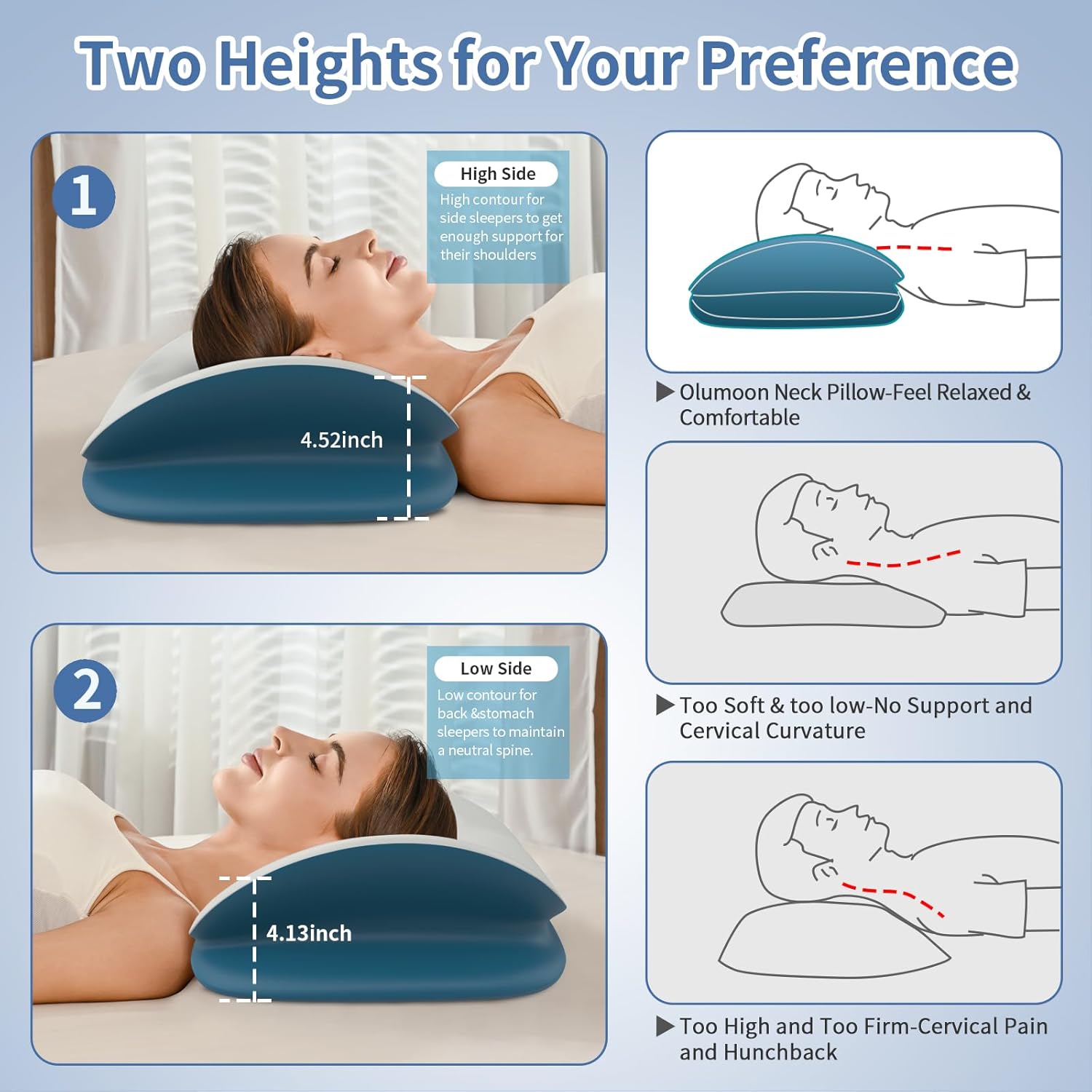 - [Say Goodbye to Neck Pain with Ergonomic Cervical Pillow]: Designed specifically to relieve neck pain, our contoured pillow supports your cervical spine, aligning your neck and head for a better night's sleep. Whether you're a side, back, or stomach sleeper, this Olumoon neck pillows ensures proper posture, helping you wake up feeling refreshed and pain-free.