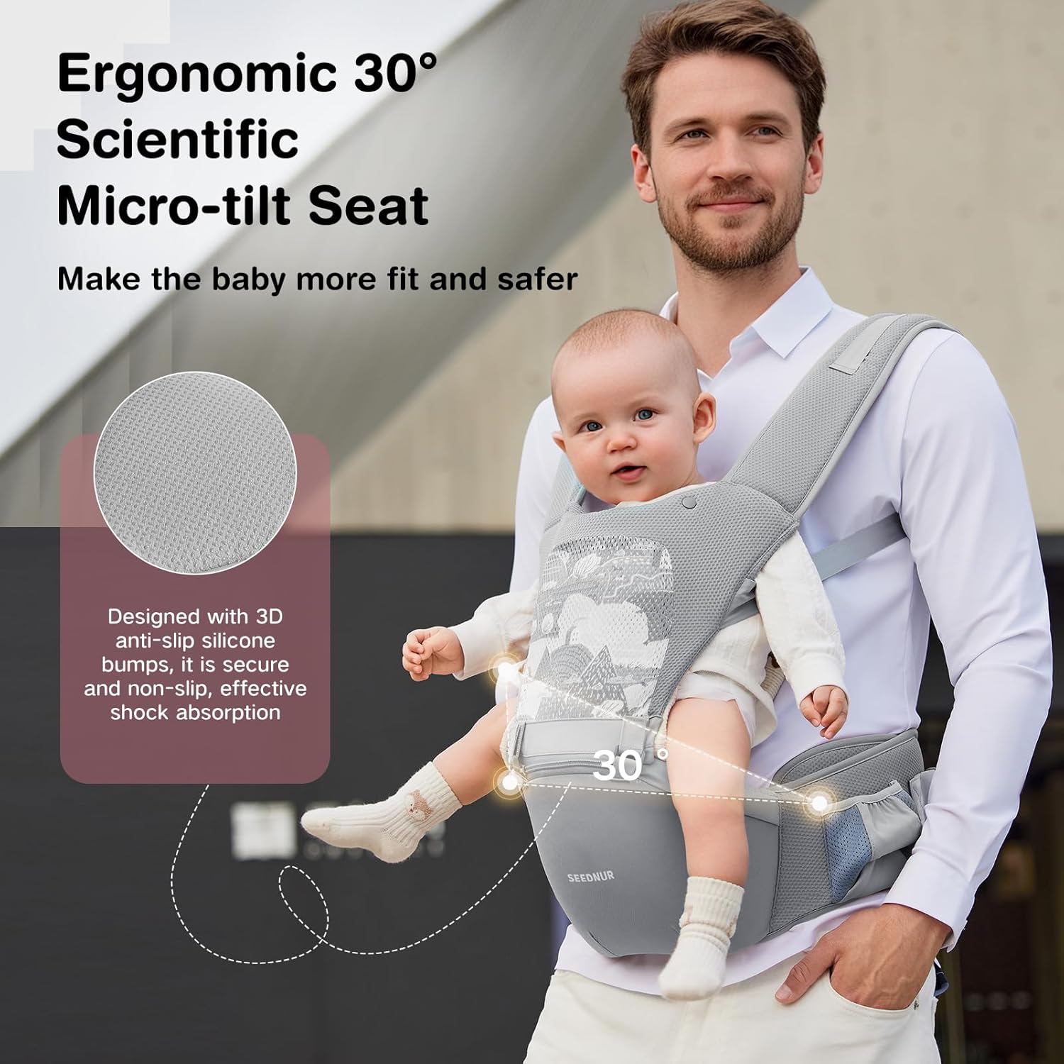 - 【6-in-1 Versatile Baby Carrier】SEEDNUR baby carrier offers 6 carrying positions—hip seat (sitting/lying) and carrier (front-in, front-out, back)—suitable from newborn to toddler. Hip baby carrier is best used by babies 6 months and older (or 15 lbs+) who can sit upright independently. The ergonomic seat width perfectly fits your baby's leg position and promotes healthy hips.