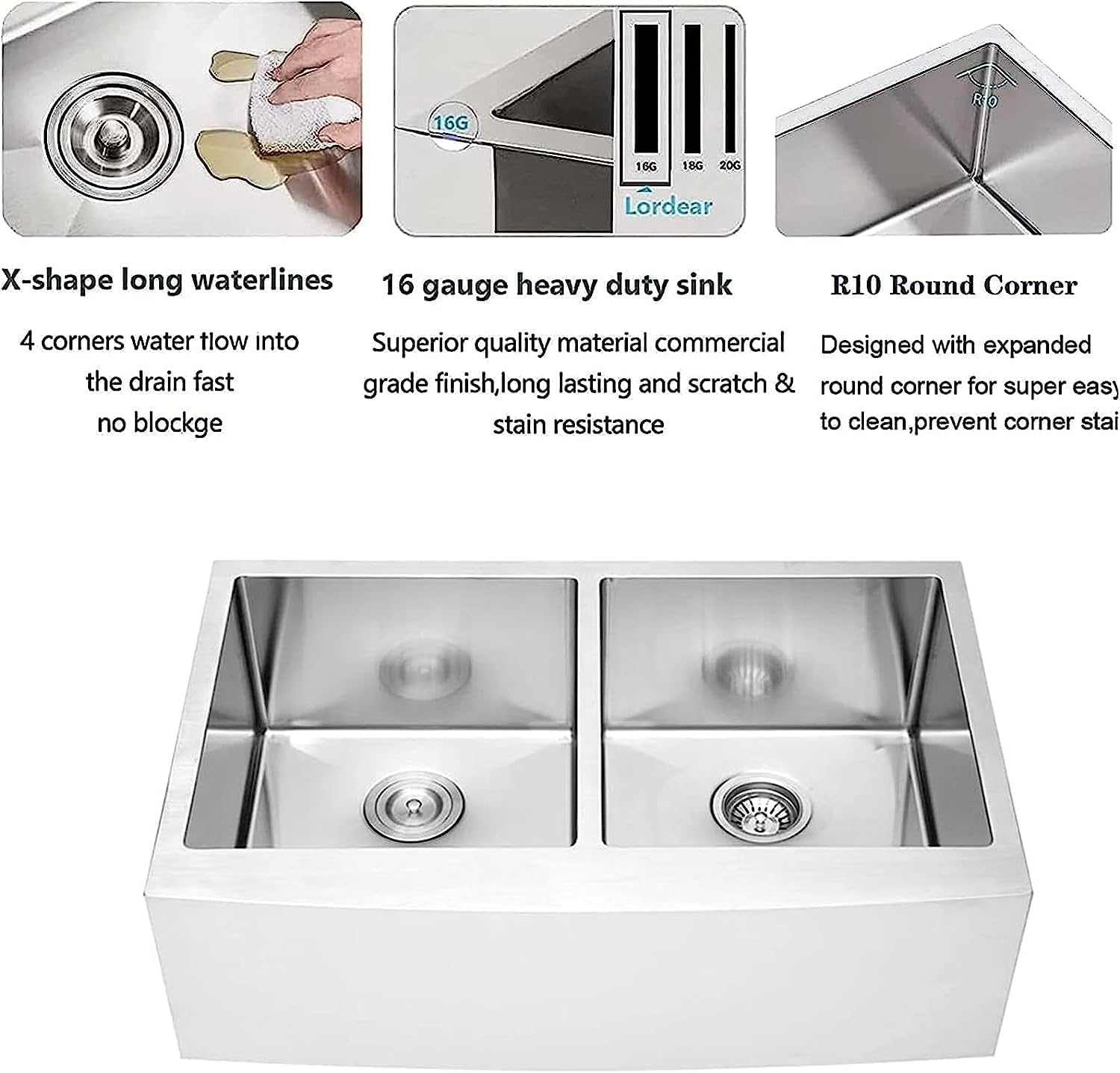 - Premium STAINLESS STEEL 36 Inch Farmhouse Sink - Lordear 36 double bowl farmhouse sink is contructed with RUST-resistant T304 stainless steel in TRU16 real 16-gauge for superior strength and durability. More thicker than 18 gauge sink. Heat resistant features also make this sink can stand hign temperature cookingware or hot pans without damaging its beautiful surface, built for long term service.