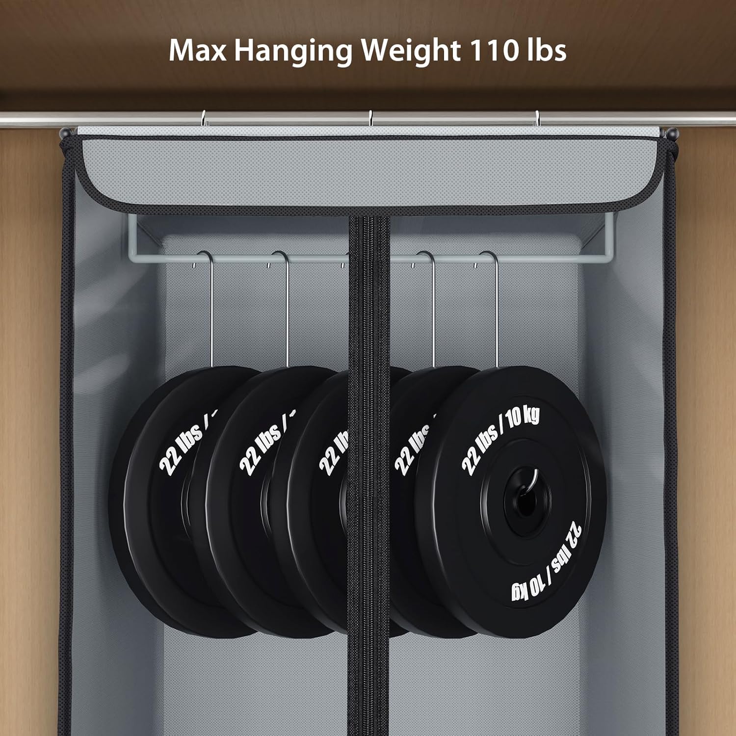 - [Upgraded Heavy Construction] The garment bags have a very sturdy metal hanger with 3 metal hooks which has a strong load-bearing capacity for at least 110lbs. Four fiber sticks get through the top frame that keep it's shape and also keep the bag from squeezing the clothes. The rod lies within the zippered section so that adding or removing clothes hangers is quick and easily.