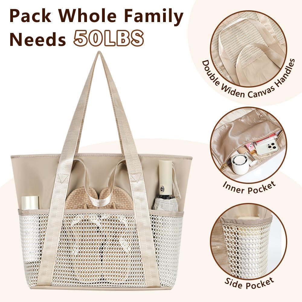 Waterproof Sandproof Beach Bag with Zipper and 6 Pockets - Foldable Lightweight Tote for Pool, Travel