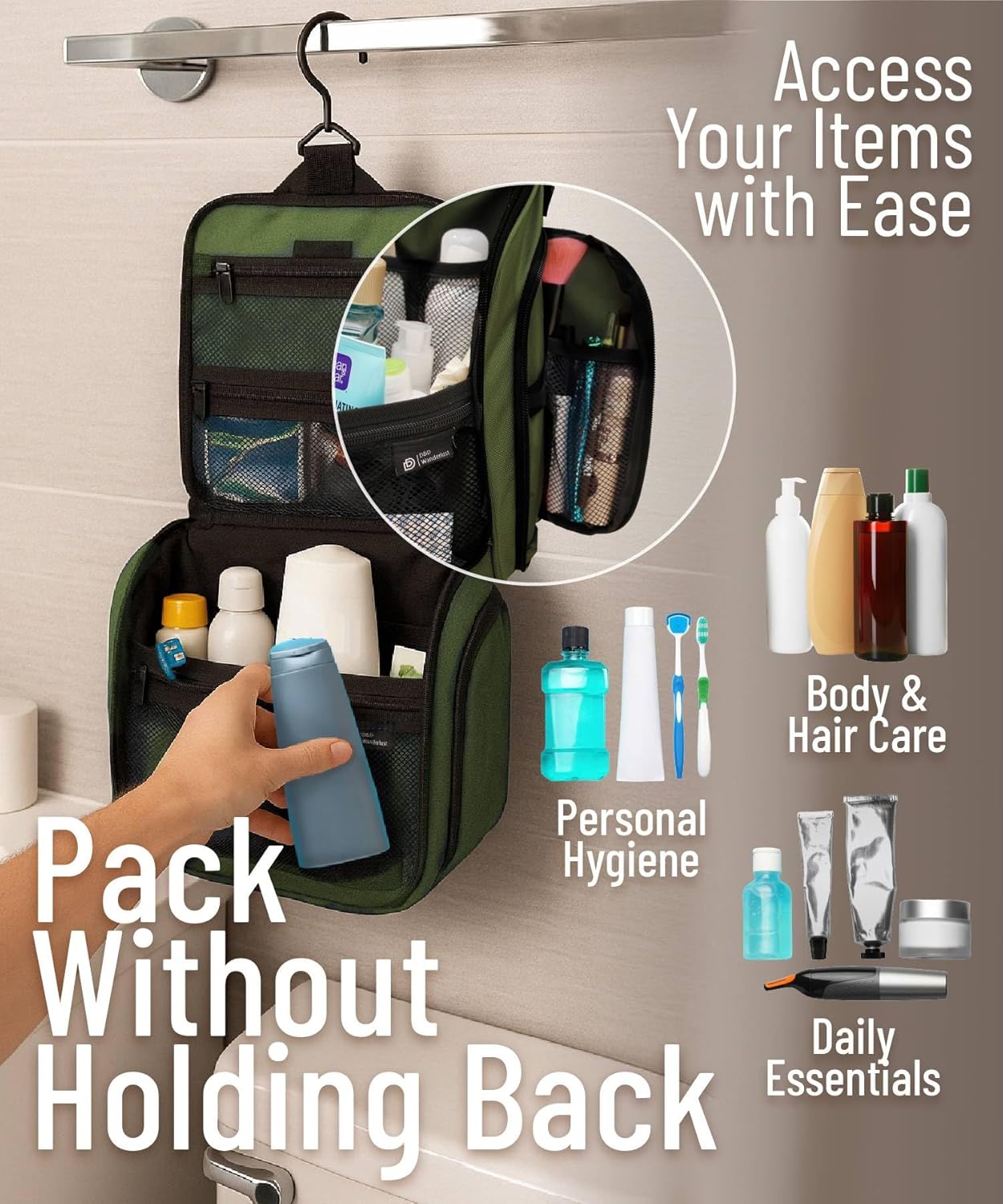 - Convenient Hanging Hook: The XXL metal swivel hook allows you to hang the bag anywhere, saving valuable counter space. It's perfect for use in hotels, bathrooms, or even on a camping trip.