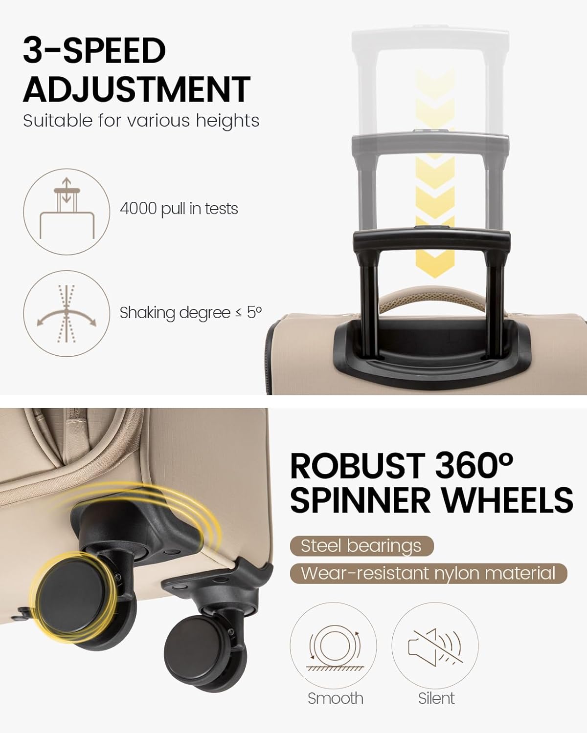 • 【Durable & Smooth-Silent Mobility】Made from premium water- and scratch-resistant polyester, this soft carry-on luggage withstands travel rigors. Its 360° silent spinner wheels feature a precision shaft and thickened design for wear resistance, quiet operation, and superior load capacity.