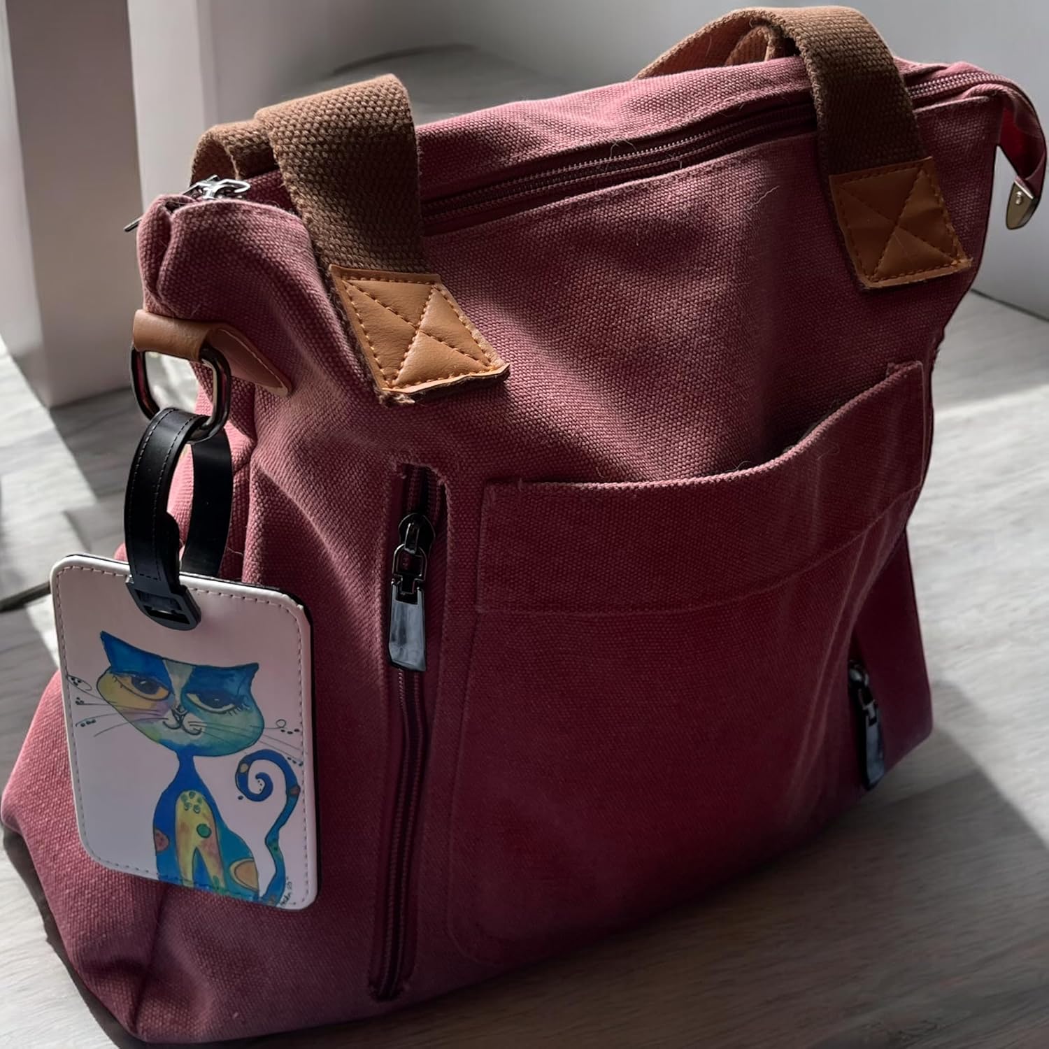 - DUAL-SIDED FUNCTIONALITY: Set includes 2 matching luggage tags with clear ID windows on one side and artistic cat design on the other