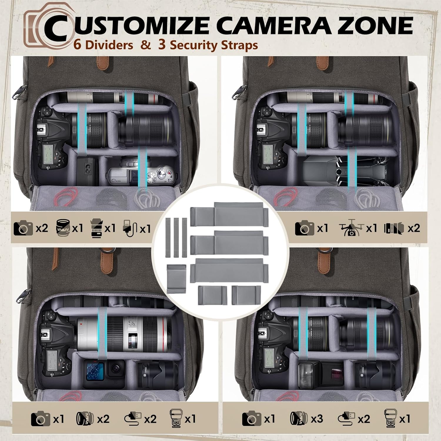 - SUPERIOR CAMERA PROTECTION: Made from water-resistant and scratch-resistant canvas, equipped with a waterproof rain cover, this waterproof camera backpack provides dual protection for your precious photography accessories from any unexpected weather. Soft velvet lining and 360°padded cushioning of the photography backpack ensure shock absorption and safeguard cameras, lenses, flash from impacts, scratches, and other potential damages.