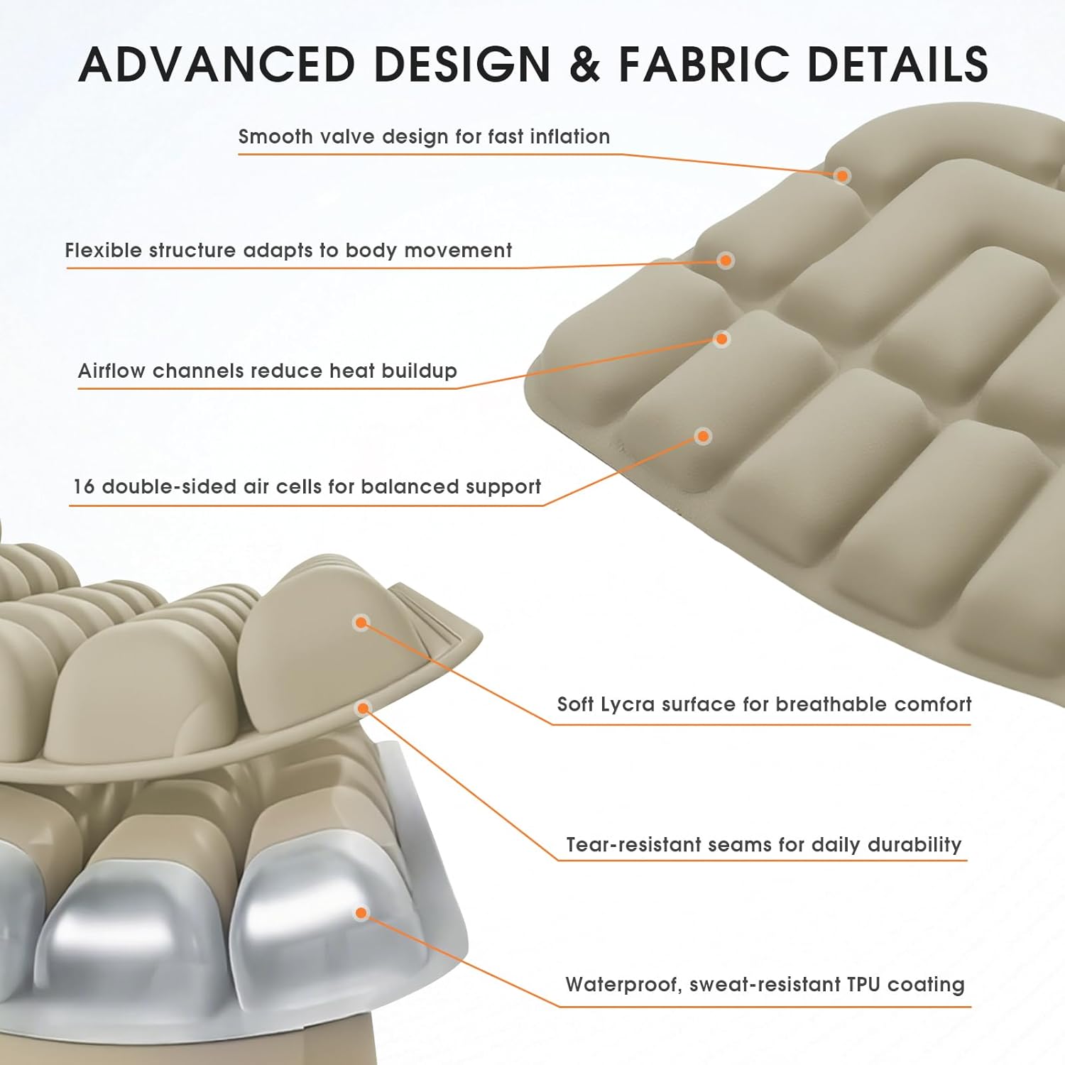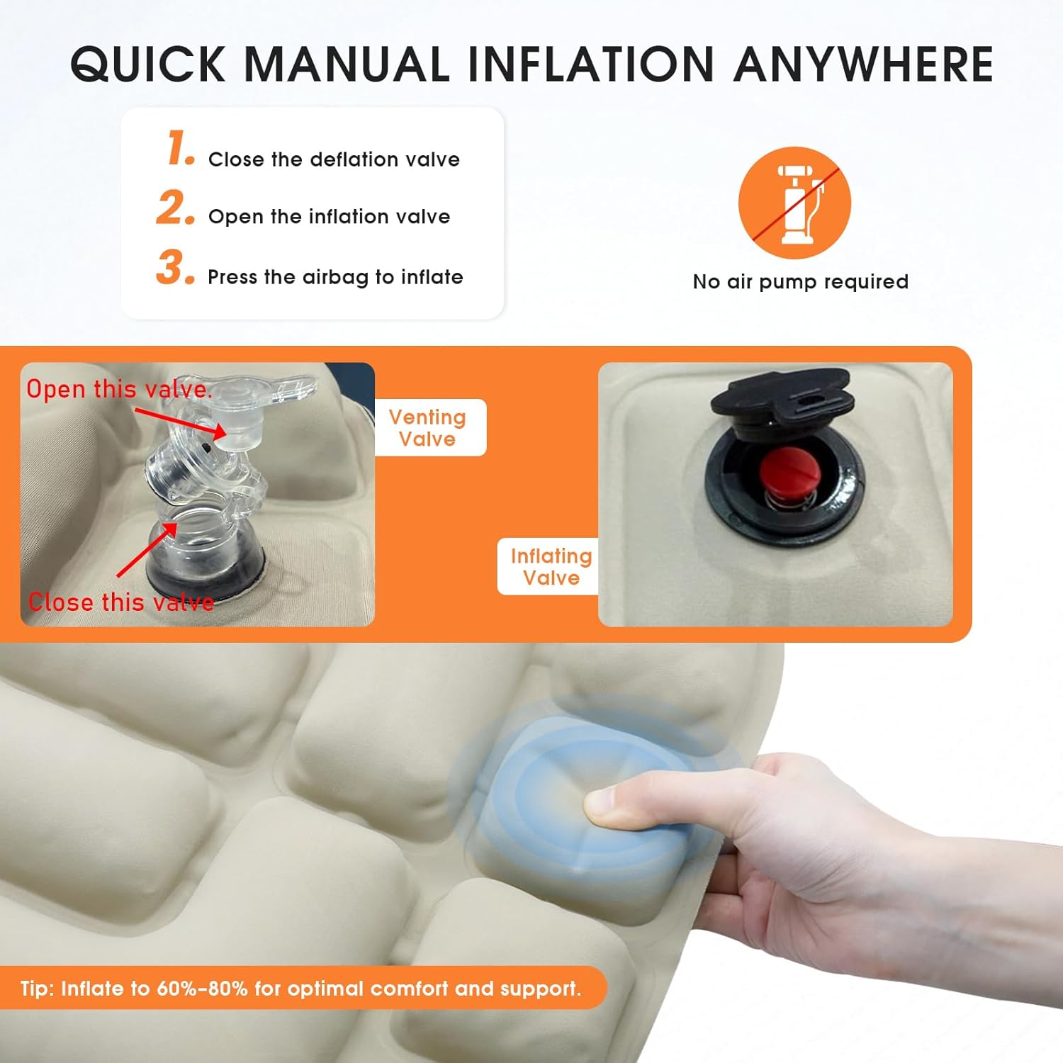 - 【Quick Inflating for Instant Comfort】Easily inflate this 3D inflatable cushion by manual presses—no pump needed! The system ensures customizable firmness and reliable support. Portable and lightweight for airplane seats, car seats, and office chairs. Warm Tip: First inflation takes 2–3 minutes, then under 1 minute thereafter.