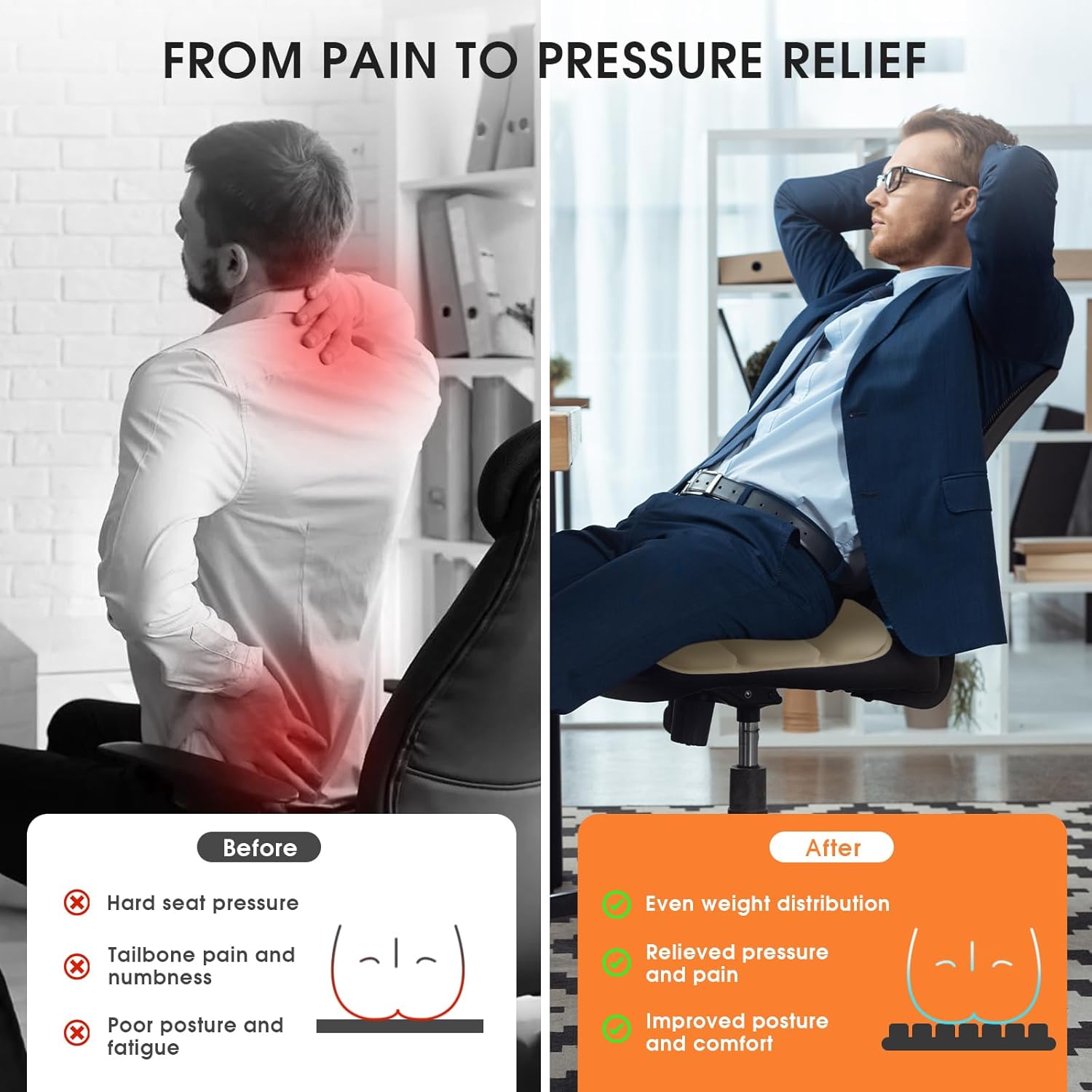 - 【Double-Sided Air Cell Pressure Relief】Built with 16 dual‑surface air cells, this inflatable seat pad evenly disperses pressure to ease strain on your tailbone, hips, lower back, and spine. Ideal for relieving buttocks pain, sciatica, coccyx discomfort, and back pain during extended sitting at home or on the go.