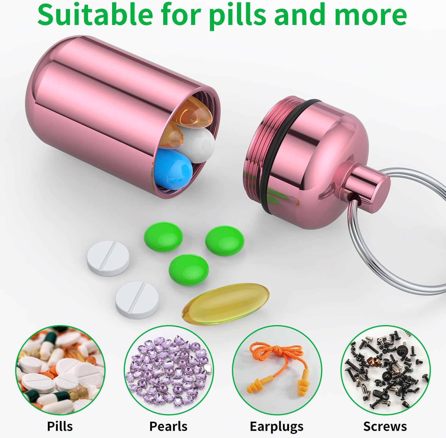 - Multi-Function: The pill holder keyring is not only for storing daily drugs, vitamins, supplements, but also perfect for storing many other small items, such as necklaces, jewelry, earplugs, spices or any other small things you want to protect.