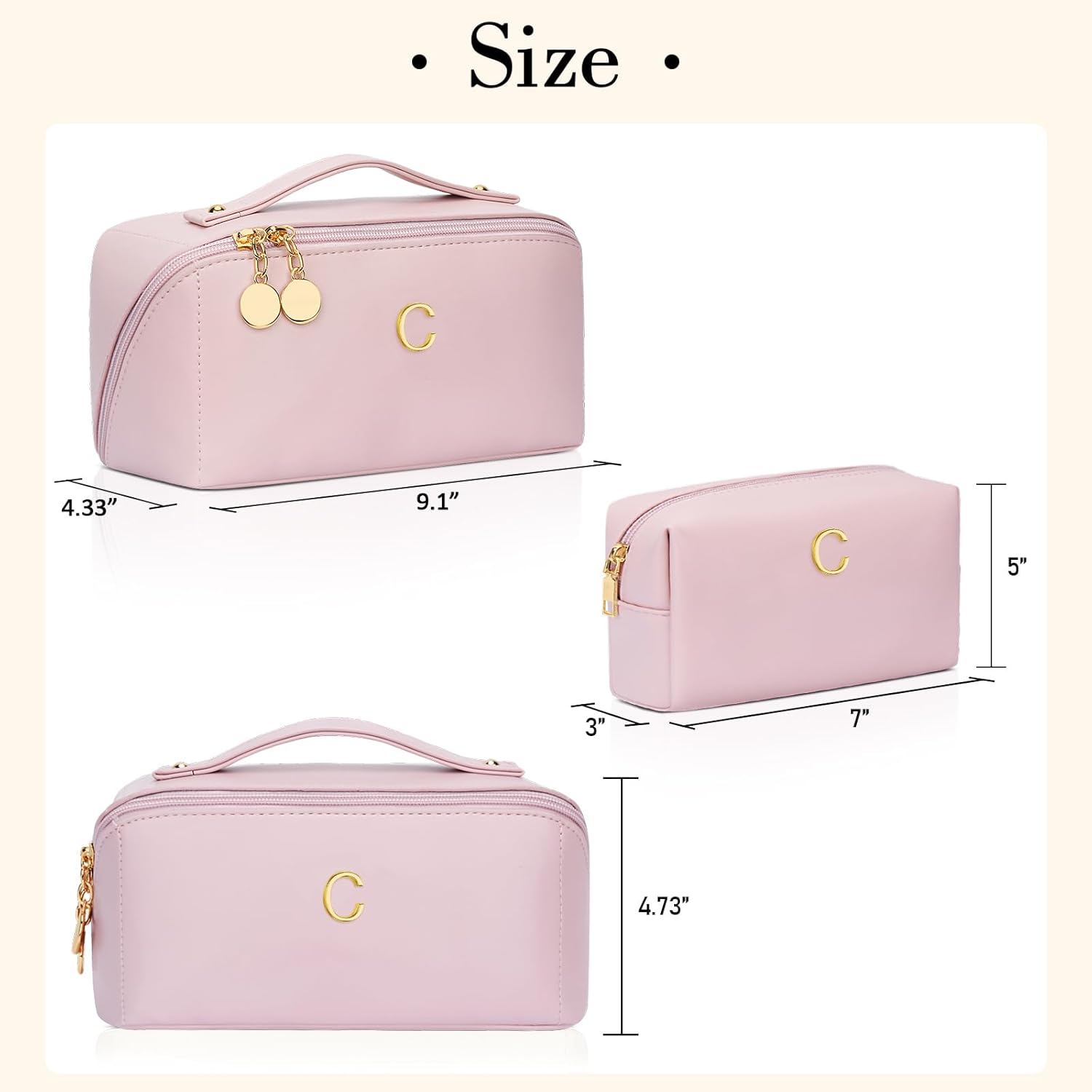 Birthday Gifts for Women Teen Girl, Personalized Initial Makeup Organizer Bag Set, Open Flat Travel Cosmetic Bag With Clear Divider and Handle(Pink,C)
