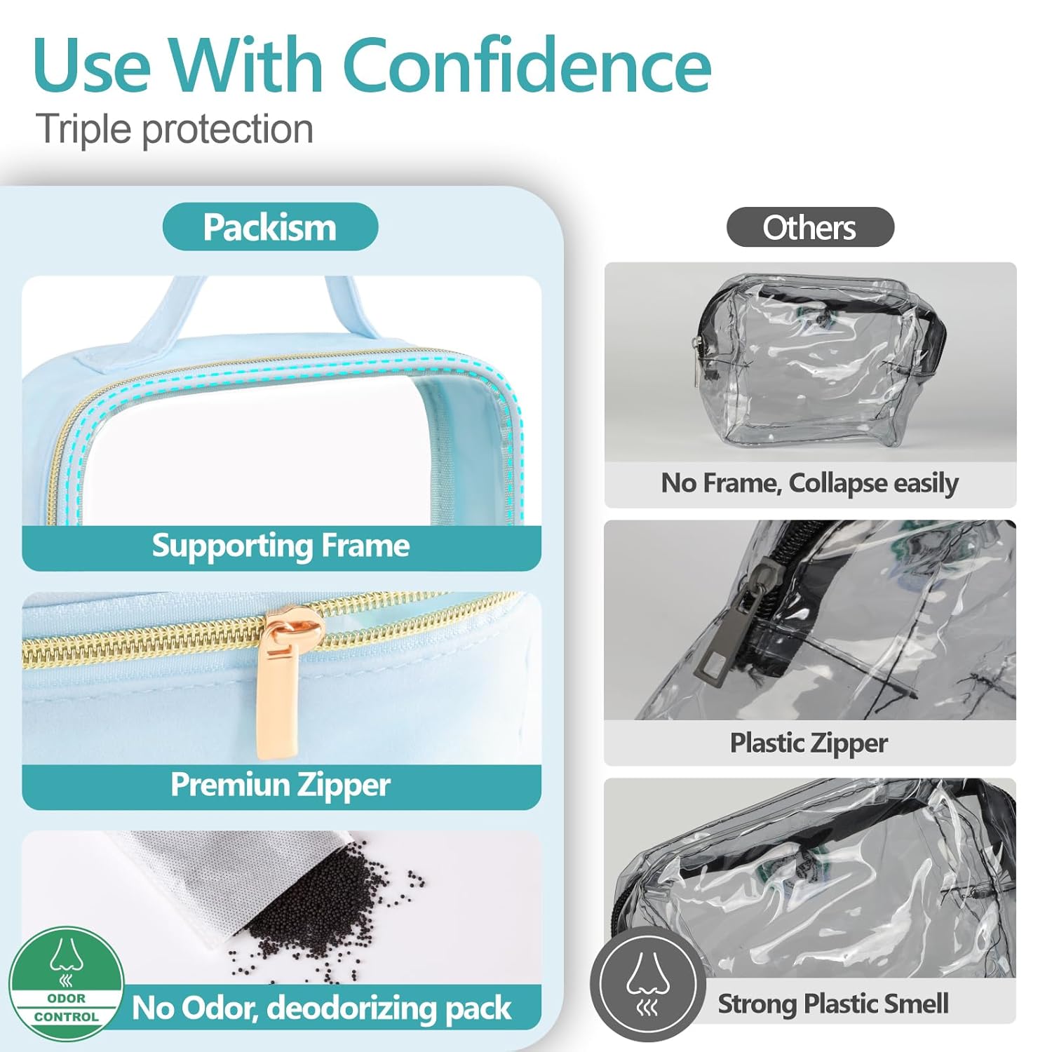PACKISM Clear Makeup Bag - 3 Pack TSA Approved Toiletry Bag with Handle and 180° Large Opening, Sturdy Clear Toiletry Bag Fit Carry-on Travel Essential, Travel Bags for Toiletries, Ice Blue