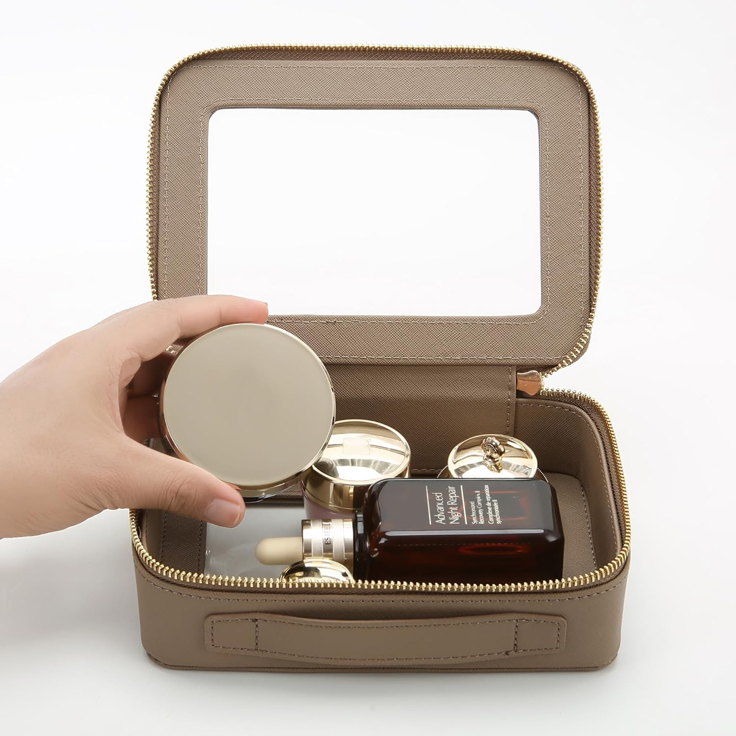 - ❤【LUXURY DESIGN】Measuring 9'' x 6.5'' x 3''(23cm x16.5cm x 7.8cm), our makeup bag is leek and stylish, this makeup travel organizer was designed in a minimalist boxy shape and a sweet off-white color. Crafted in beautiful PU leather and finished with polished hardware, it's the clear pouch you'd be happy with sitting out on display beside you.