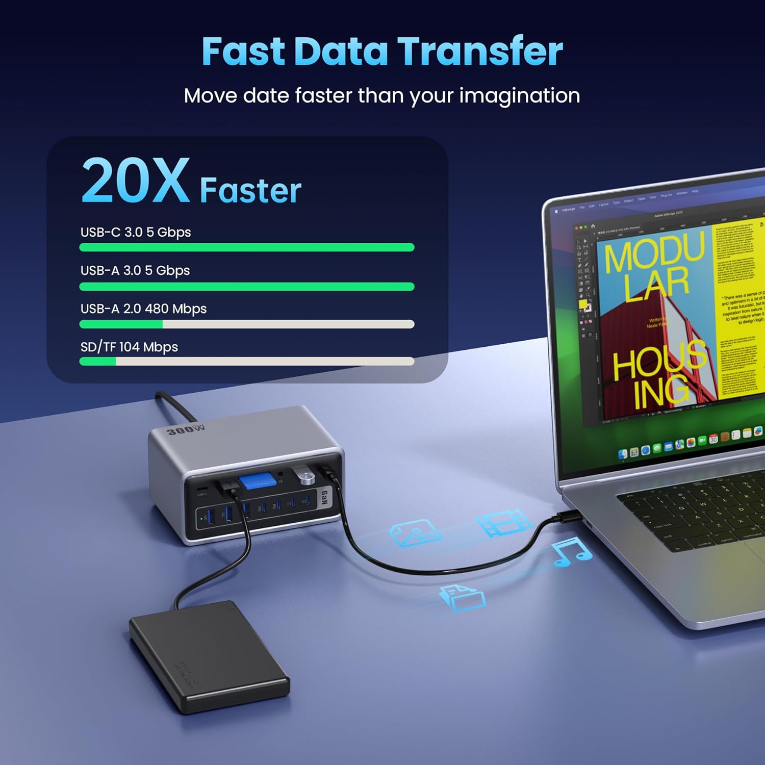 - ă20-in-1 300W USB Docking Station Huge ExpansionăThe all-in-one USB C docking station meets all your expansion needs, transforms your laptop into a high efficience workstation with ease! With this usb c hub multiple adapter, you'll get 100W PD USB-C port for laptops, 7 USB ports (3 QC USB-A + 4 USB -C) sharging 200W of power, 3 USB data ports support 5Gbps max data transfer, SD/TF card slots, 3.5mm Audio, VGA, 2 x 4K HDMI, DisplayPort, Gigabit Ethernet, AC power input with 1.5ft charging cord.