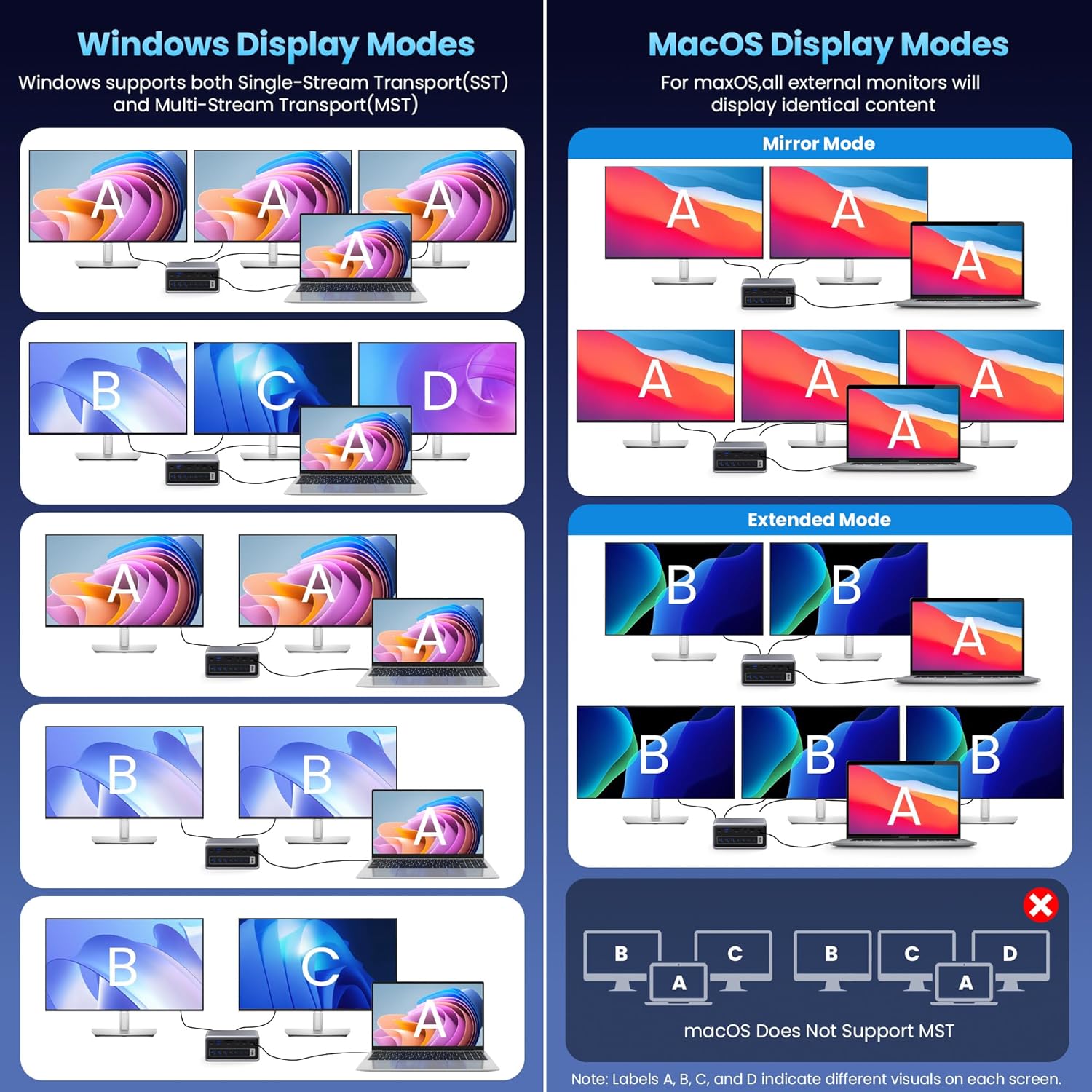 - ăTriple Display Dual 4K Docking StationăExtend workflows across 3 external monitors (2 x 4K HDMI + DP @ 4K 60Hz + VGA @ 1080p) for immersive multitasking. Quad-screen mode (laptop + 3 externals) boosts productivity for designers, traders, and gamers. Note: Only Windows System support MST and SST(Mirror & Extend Mode); MacOS only support Single-Stream Transport (SST) mode, which means all connected monitors will show the same content.