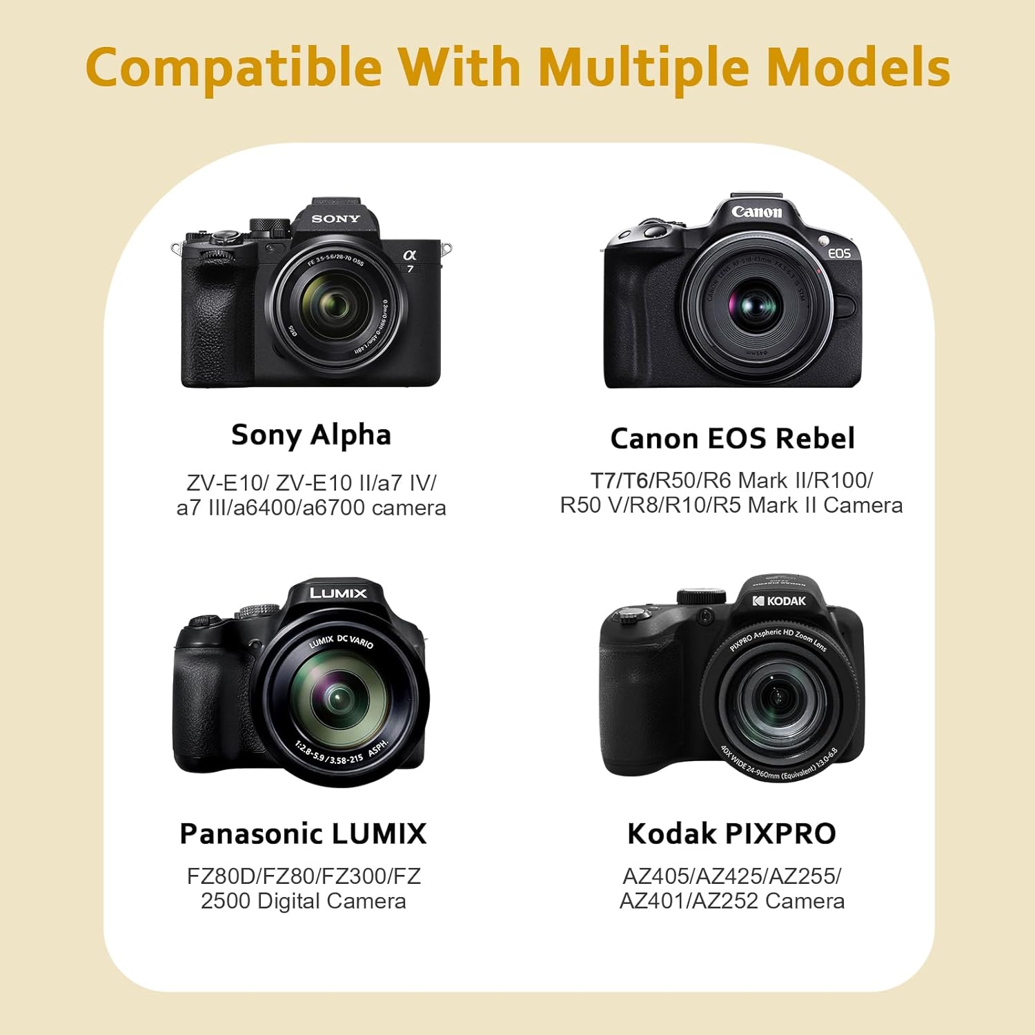 - Perfect Fit:Specifically designed for the KODAK PIXPRO AZ405/AZ425/AZ255/AZ401/AZ252/AZ528, Canon EOS Rebel T7/R50/R6 Mark II/R100/R50 V/T6/R8/R10/R5 Mark II/RP/R7/5D Mark IV/SL3/R5/T100/80D/XTi/T7i/T6i/T5/T5i/6D Mark II/70D/XT/T3i/T3/SL2/R5 C/M50 Mark II/90D/M50 DSLR SLR Camera, Sony Alpha ZV-E10/a6400/7 IV/6700/a7 III/FX3/ZVE10 II/A6100/7R V/7C II/a6000 Camera, Nikon Z6 III/Z50 II/Z 6II/Z 8/Z 30/Z 7II/D7500/D850/D3500 Camera and Panasonic LUMIX FZ80D/G85 Camera