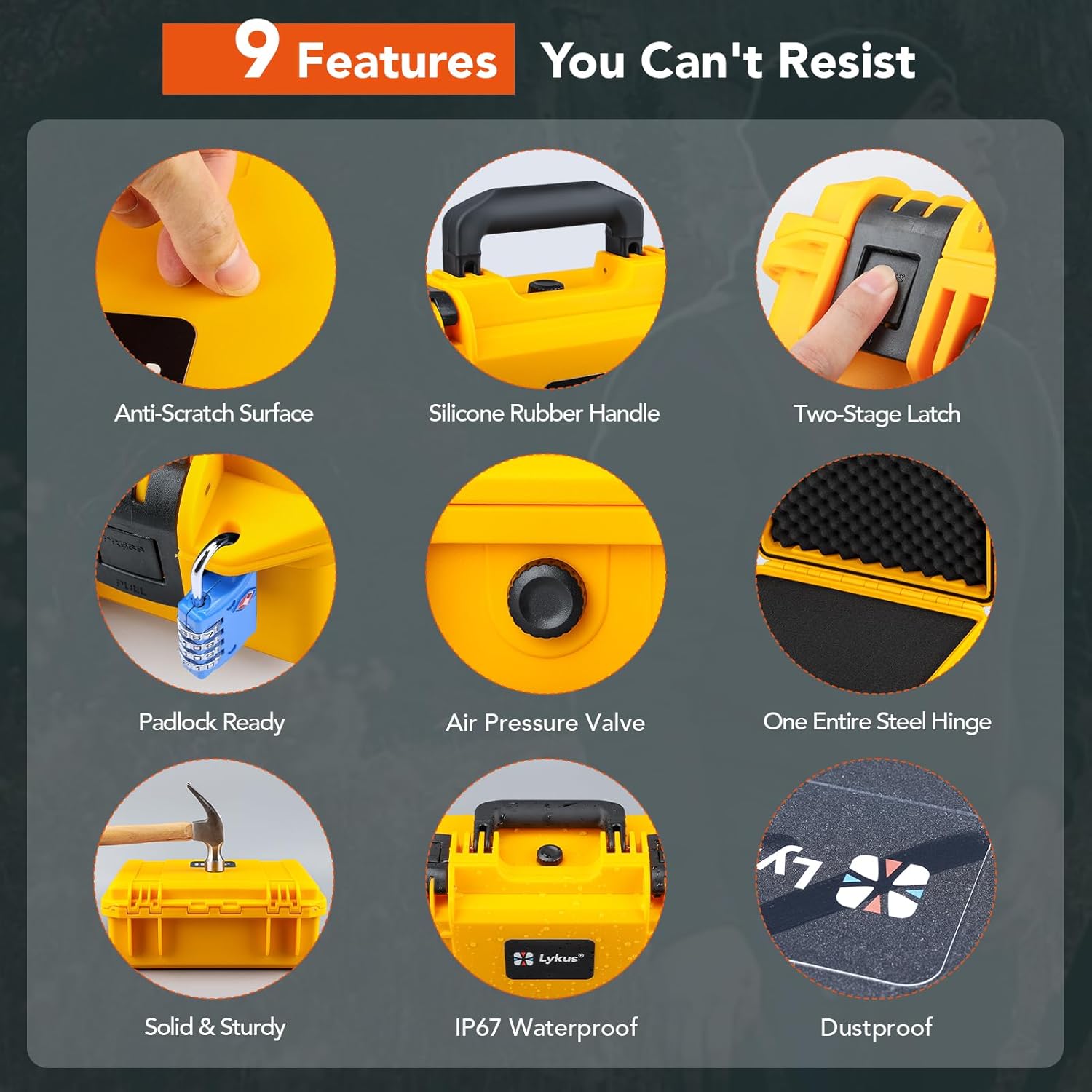 Lykus HC-3010 Waterproof Hard Case with Customizable Foam Insert, Interior Size 11.81x7.87x4.72 in, Suitable for Pistol, Camera, Lens, Drone, Mic, Flashlight, Electronics, Tools, and More