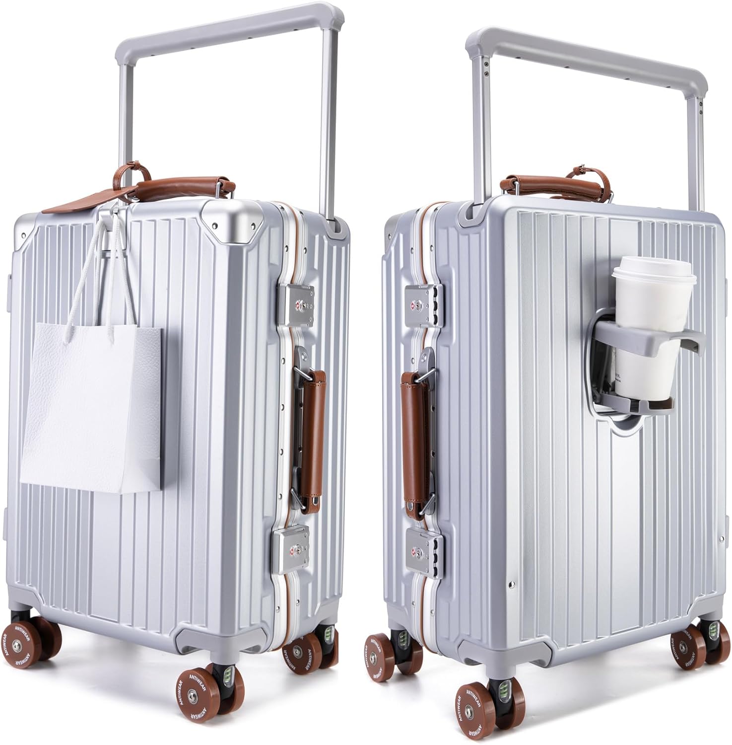 - Multi-Functional and Stylish Aluminum Suitcase: This suitcase is designed for convenience and practicality. It features a built-in cup holder, allowing you to keep your drink easily accessible while on the go. The aluminum alloy corner guards enhance durability, protecting your suitcase from wear and tear. Additionally, the side hook provides a handy spot for hanging bags or accessories, ensuring you stay organized during your travels.