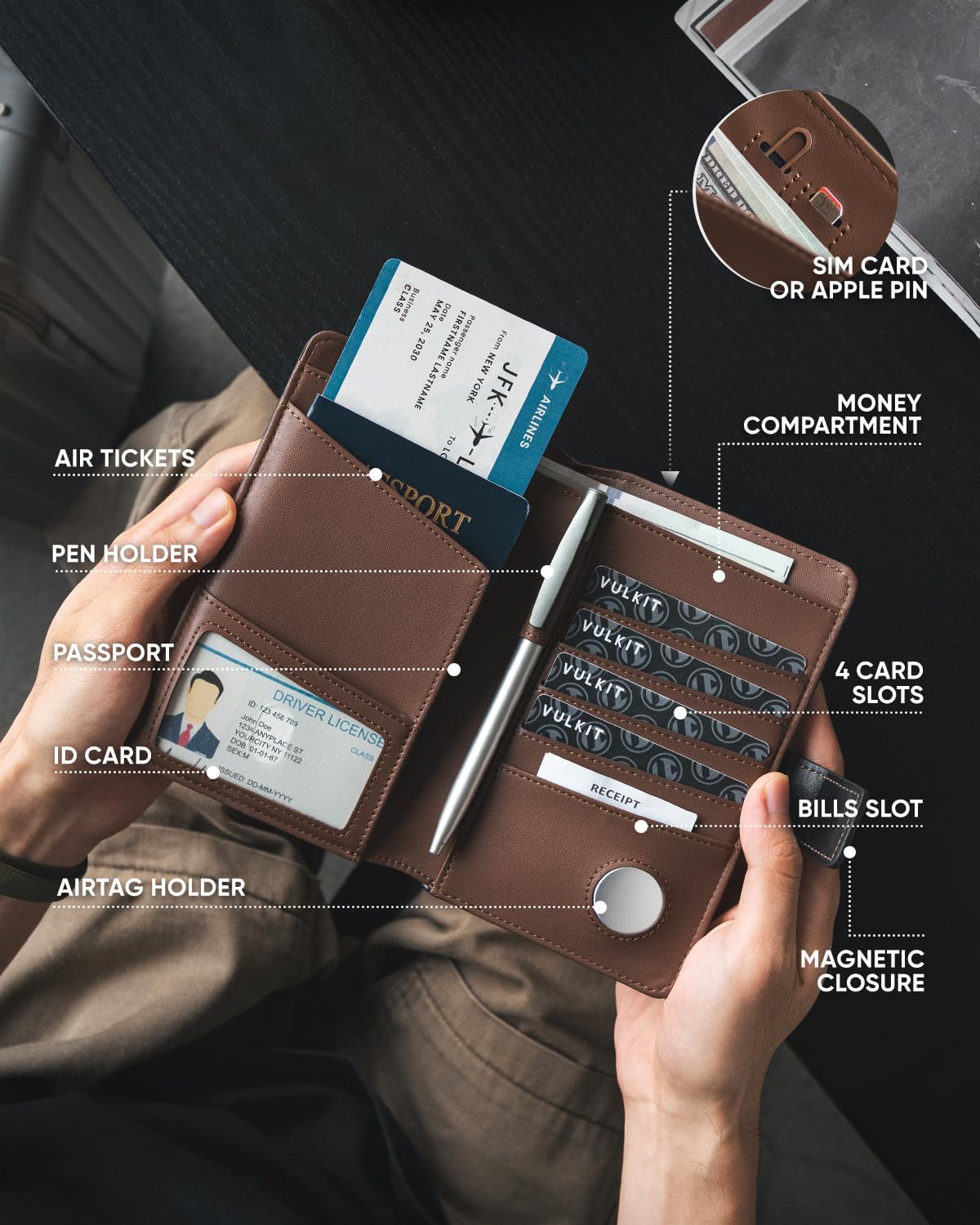 VULKIT Passport Holder with Airtag Holder RFID Blocking Passport Wallet Travel Leather Passport for Women(Black Brown)