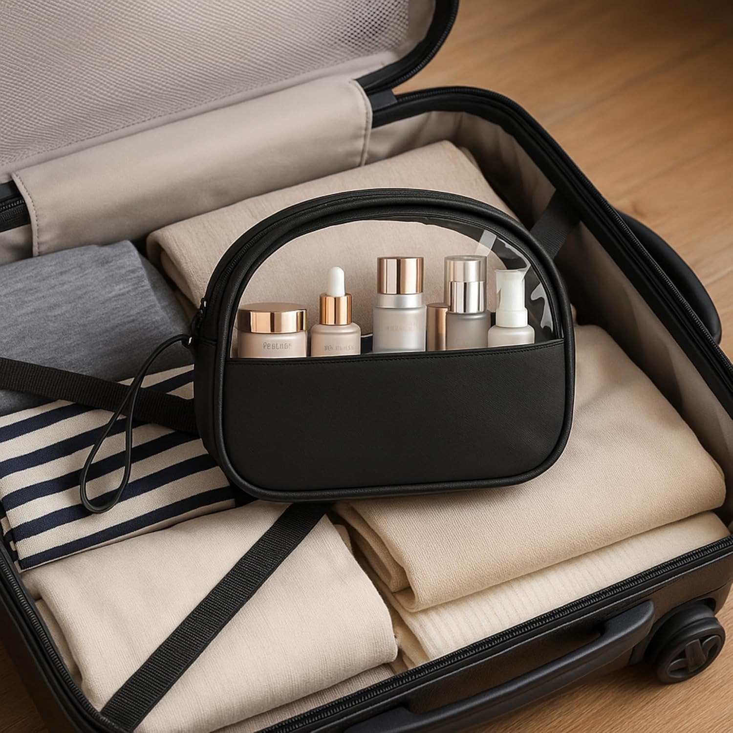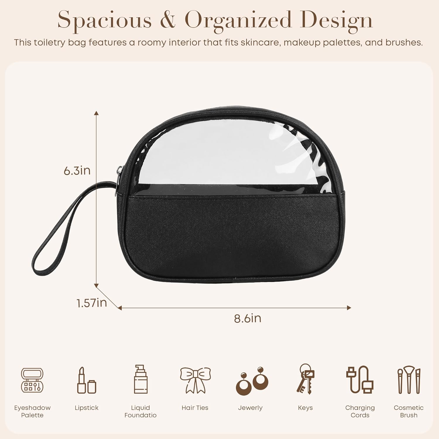 - Travel Toiletry Clear Makeup Bag - Featuring a sleek semi-circle design, this compact organizer (8.6'' x 1.57'' x 6.3'' ) combines minimalist style with functionality. Crafted from premium PU leather with polished hardware, it includes a side carry strap for easy transport in purses or carry-ons. The curved silhouette maximizes interior space while maintaining a slim profile."