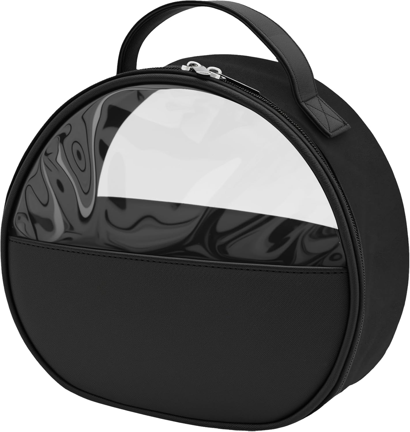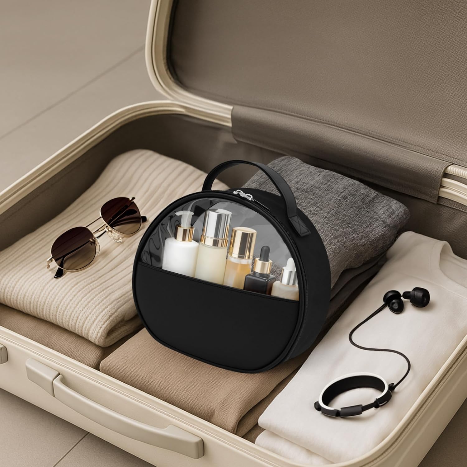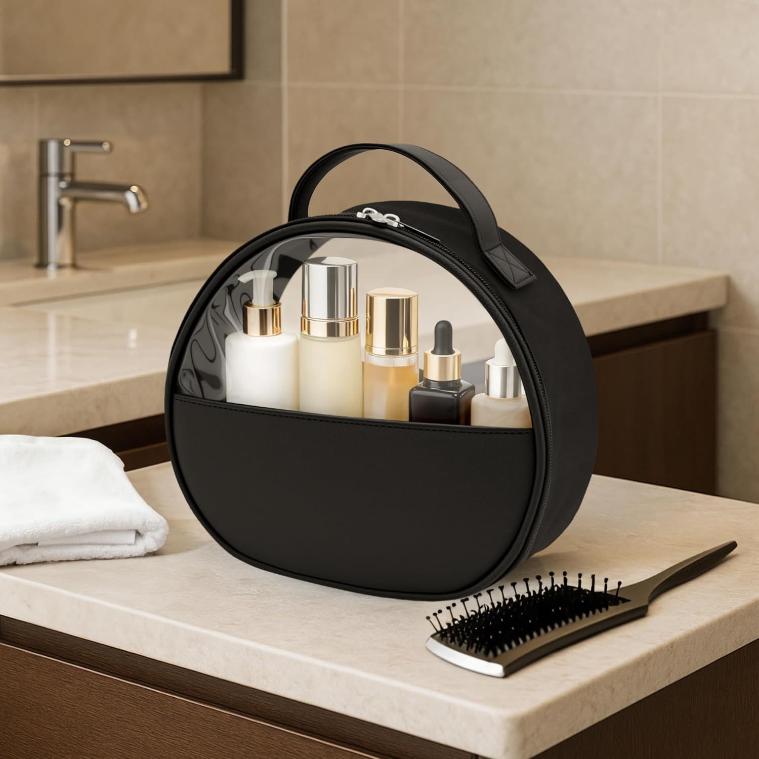 - Travel Toiletry Clear Makeup Bag - Featuring a sleek semi-circle design, this compact organizer (8.6'' x 1.97'' x 8.3'' ) combines minimalist style with functionality. Crafted from premium PU leather with polished hardware, it includes a side carry strap for easy transport in purses or carry-ons. The curved silhouette maximizes interior space while maintaining a slim profile."