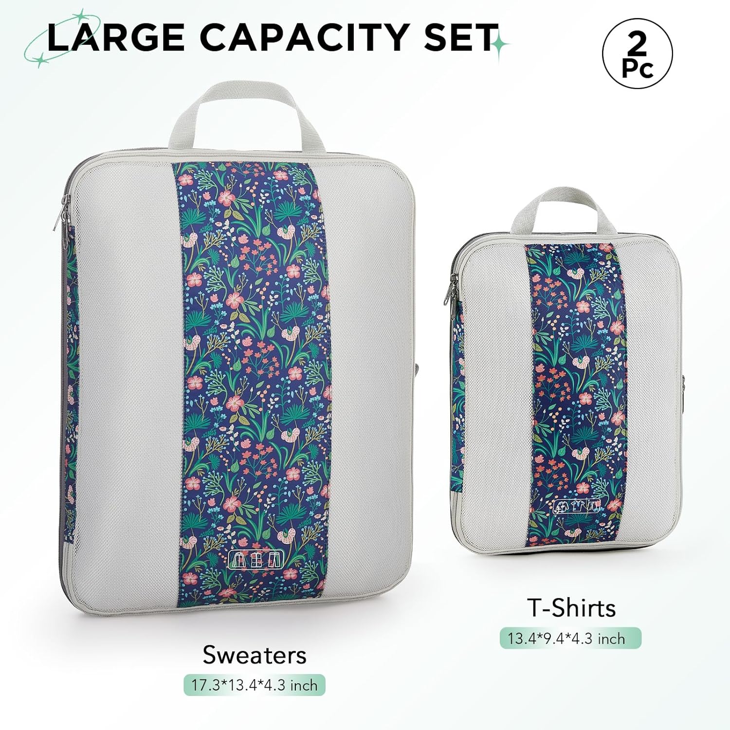 2 Set Compression Packing Cubes for Travel Essentials,Compressible Expandable Packing Cubes for Suitcase,OlarHike Luggage Organizer Bags for Travel(Dark Blue Floral)