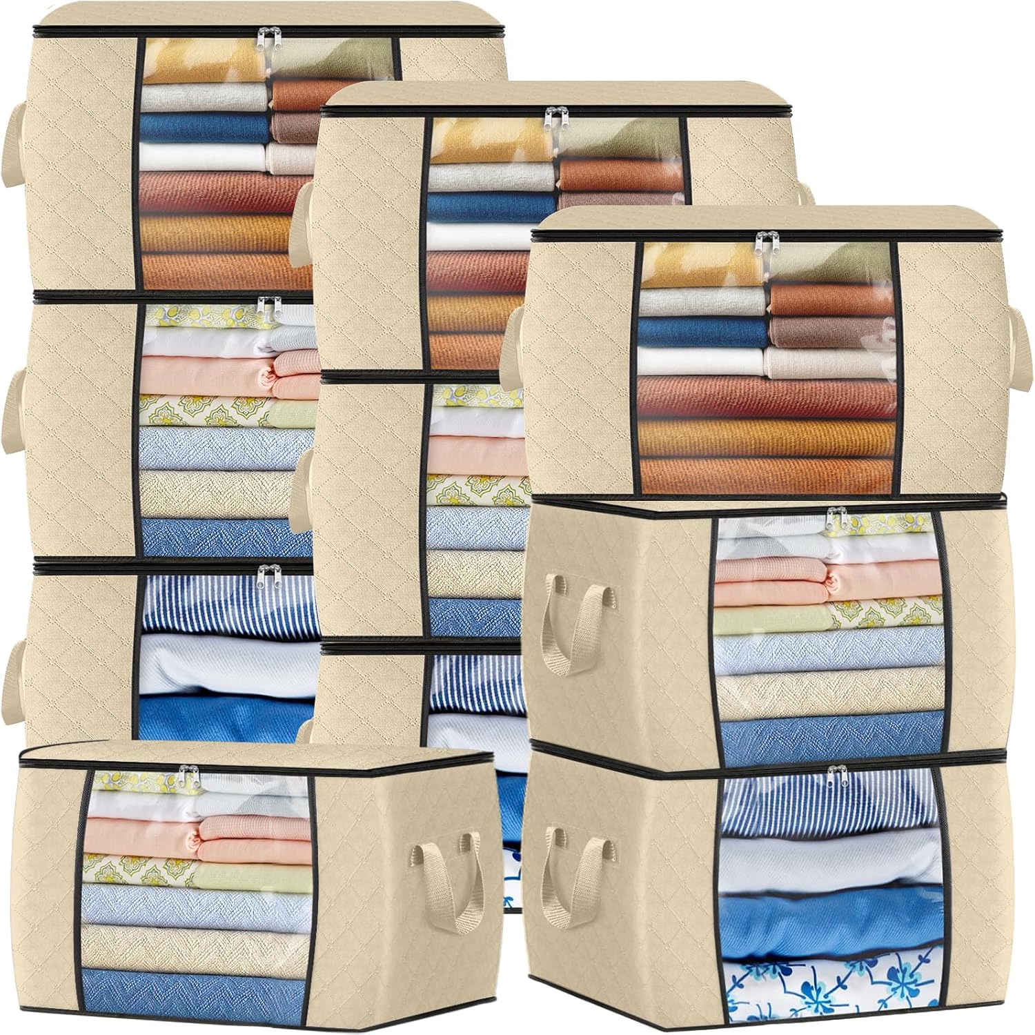 Fab totes 24 Gallons Clothes Storage, Foldable Thick Fabric Blanket Storage Bags, Containers for Organizing Bedroom, Closet, Clothing, Comforter, Organization with Handle (10 Pack,Beige)