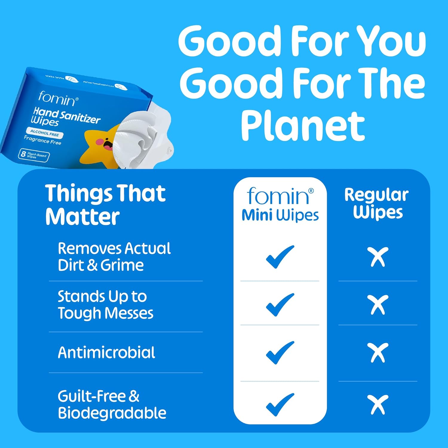 Fomin Mini Hand Sanitizer Wipes 8 Pack (8 Count) - Fragrance Free Mini Wet Wipe - pH Balanced, Biodegradable, Antibacterial On The Go Hand Sanitizing Wipes - Hypoallergenic, Plant-Based Travel Wipe