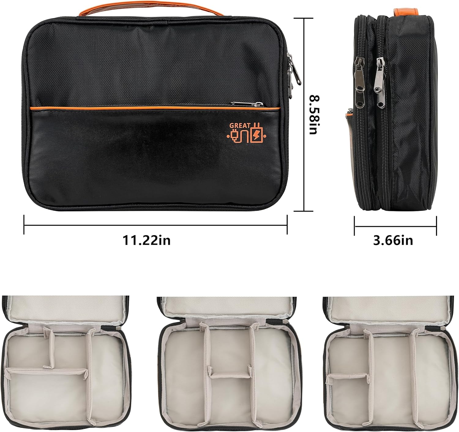 - 1️⃣ LARGE CAPACITY & DOUBLE LAYER DESIGN This electronics organizer features dual-layer compartments that offer ample storage for cables, USB drives, chargers, power banks, adapters, and more. The upper mesh pockets keep cords tangle-free, while the bottom padded dividers fit larger items like tablets or hard drives — keeping everything neat and accessible.