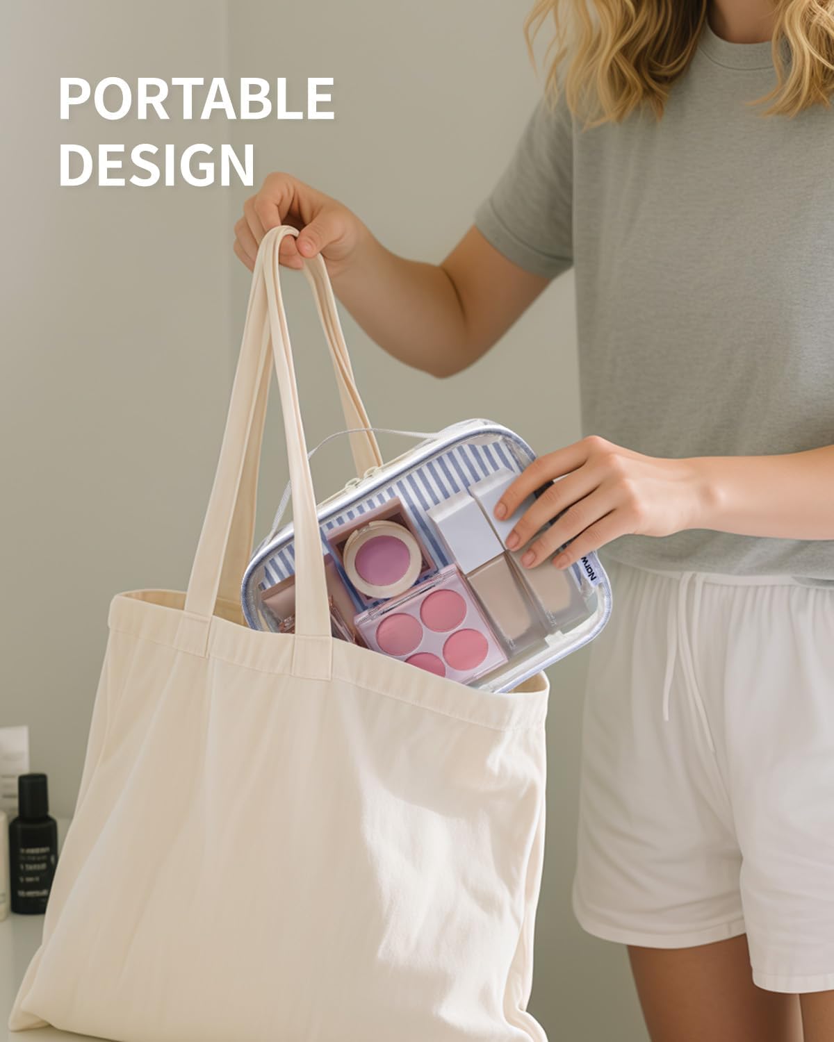 Narwey TSA Approved Clear Toiletry Bag for Travel, Waterproof PVC Clear Makeup Bags, Portable Compact Cosmetic Bag Make Up Organizer, Airport Airline Quart Size Compliant Bag (Greyish Blue Stripe)