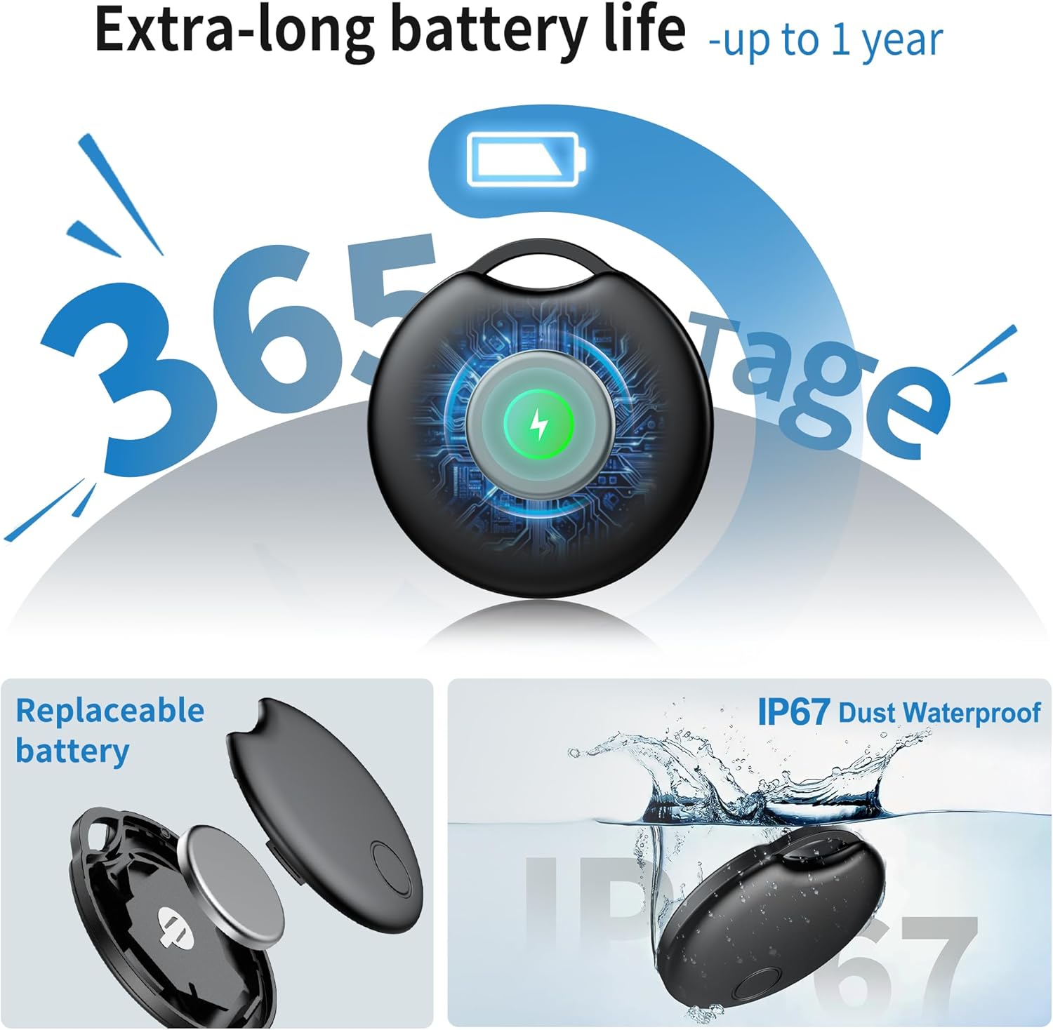 - Replaceable Battery & IP67 Water Resistance Powered by a replaceable CR2032 coin battery, each cell lasts at least 12 months. No charging required — easy to replace for long-term use. With IP67 water and dust resistance, the tracker is built to withstand splashes, rain, and everyday wear.