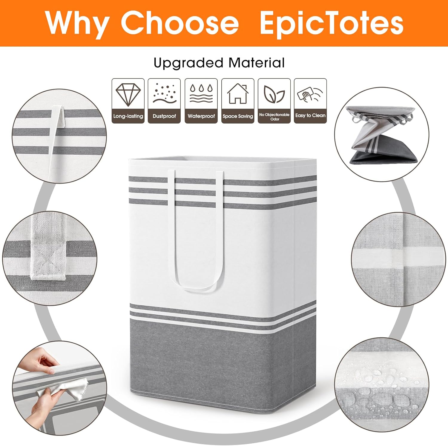 - [Premium Fabric] The exterior of EpicTotes laundry basket is made of high-quality cotton and linen materials. The thickened PEVA waterproof coating inside makes it easy to clean with a damp sponge or cloth when it gets wet or dirty. The waterproof fabric inside the EpicTotes laundry basket not only makes it easy for you to clean it, but this design also prevents items inside the laundry basket from emitting odors and moisture