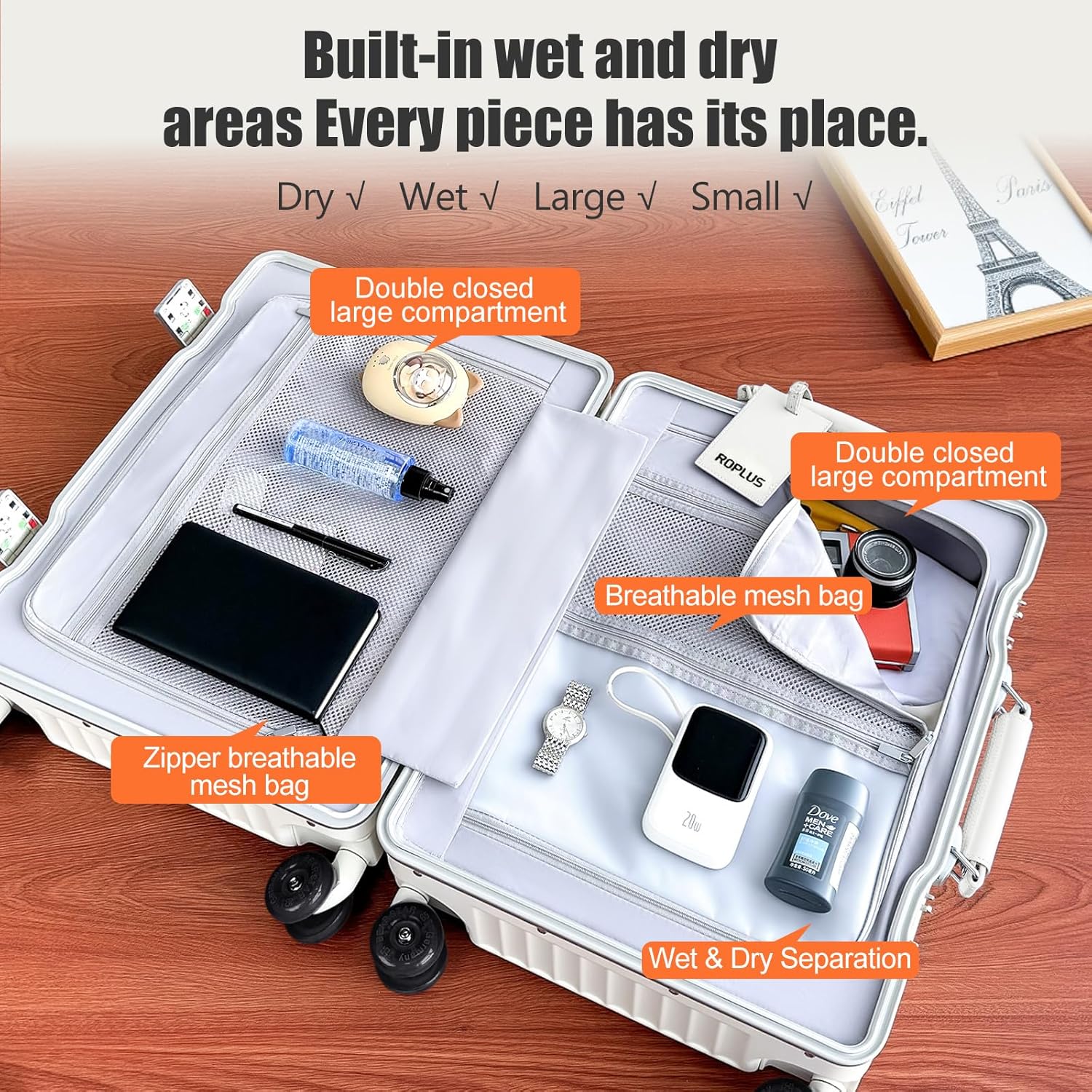 - LARGE STORAGE SPACE: Storage is the strength of this luggage. This aluminum framed suitcase has a large interior storage space with wet and dry compartments and two oversized zippered compartments for your laptop and more