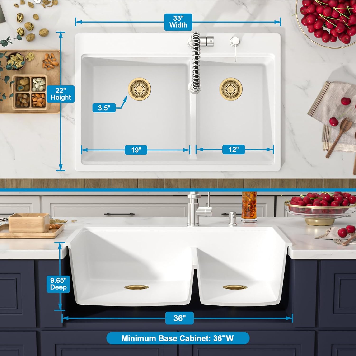 33 Inch Double Bowl White Kitchen Sinks 33x22 Granite Composite Dorp In 60/40 Basin with Luxury Accessories Quartz Workstation Sinks with Noise Reduction Durable and Hard Gold Accessoris Sink